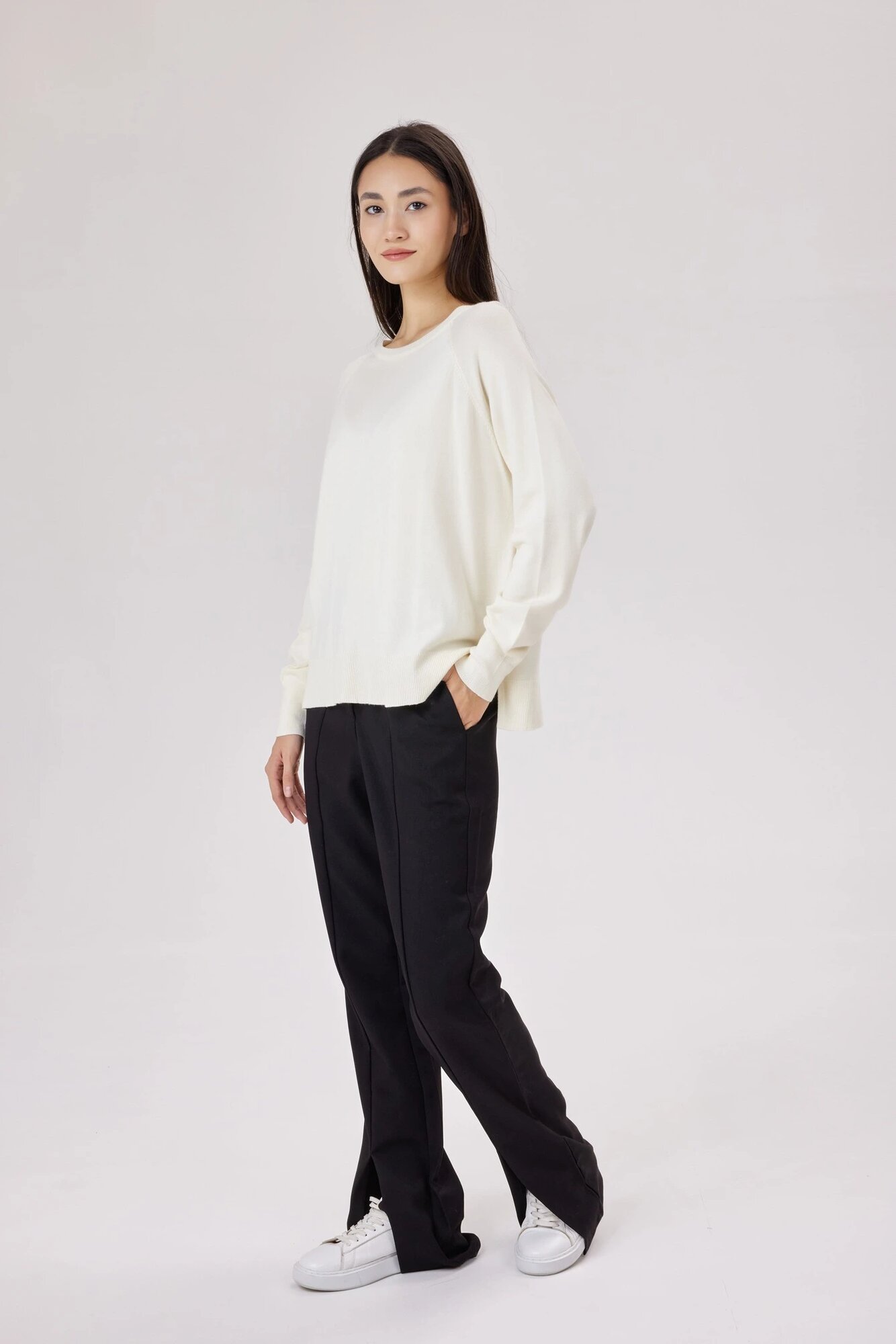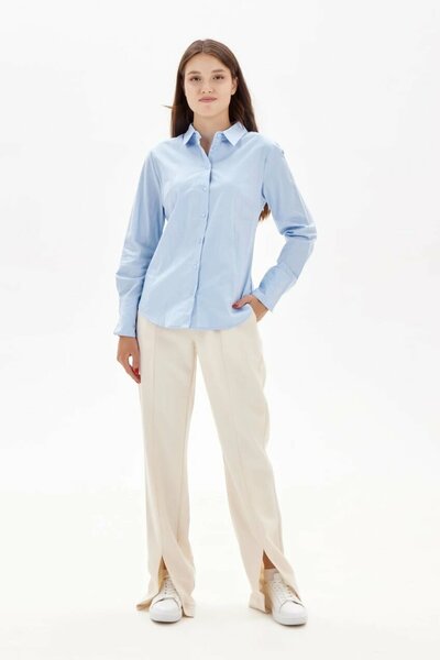 Брюки клеш с высокими разрезами на штанинах. Имеют выразительные фиксированные стрелки, которые зрительно вытягивают силуэт и делают образ более сдержанным и завершенным. Дополните модель рубашкой или топом для создания стильного изящного образа.