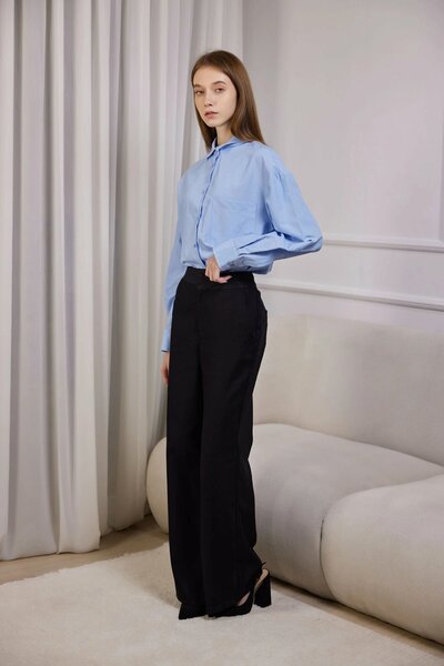 Расслабленные брюки свободного кроя на высокой посадке с оригинальным асимметричным поясом. Создавайте с моделью стильные комбинации в официальных и повседневных образах.