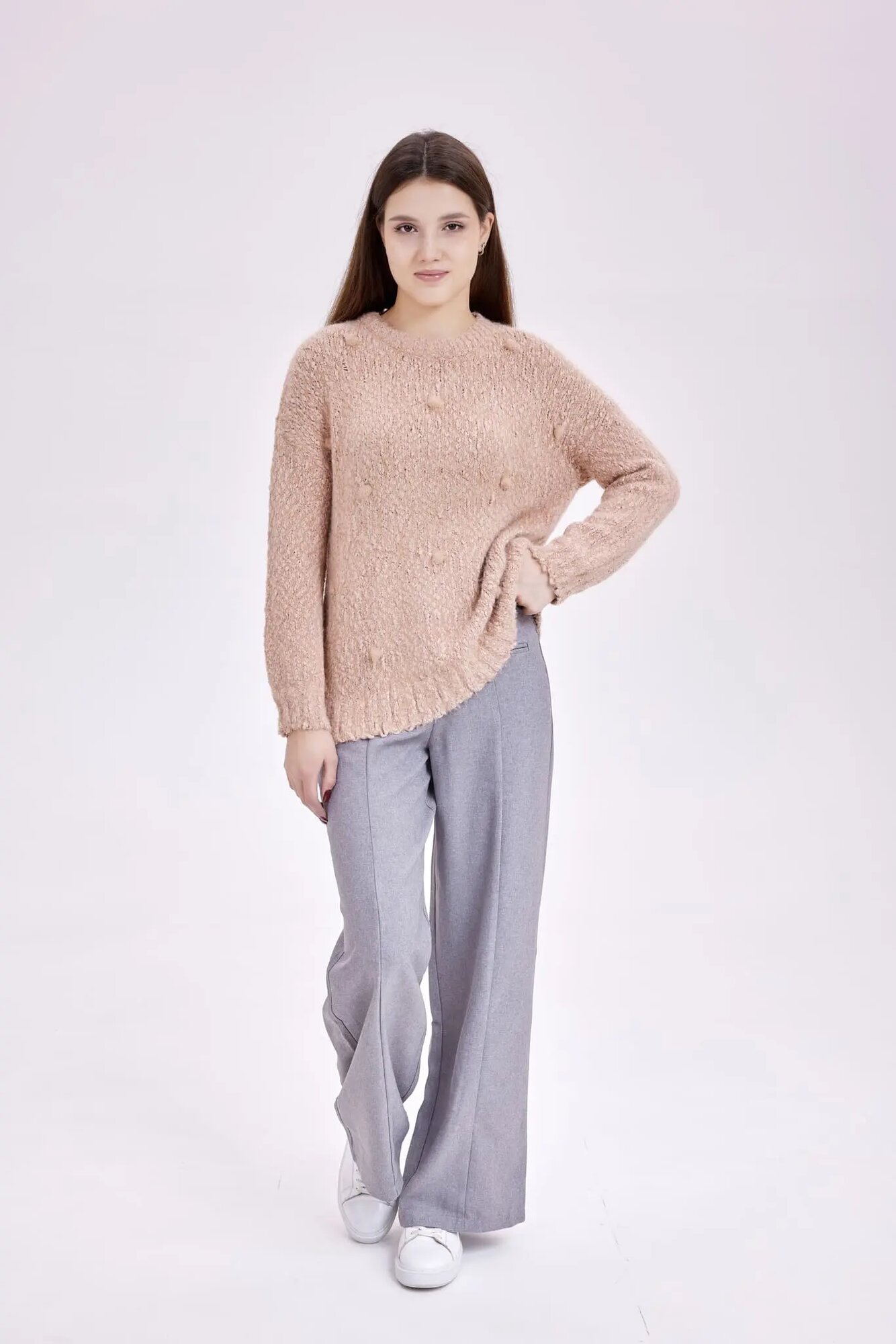 Cвободные брюки прямого кроя на средней посадке, дополненные простроченными стрелками на штанинах. Станут универсальным вариантом для включения в повседневный или деловой лук.