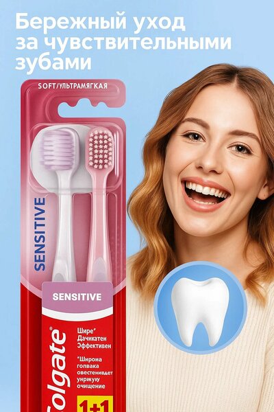 Подарите своим зубам и дёснам мягкий и деликатный уход с зубной щёткой Colgate Sensitive. Ультрамягкие щетинки обеспечивают бережную чистку, не травмируя эмаль и дёсны. Идеальна для чувствительных зубов и ежедневного использования. ✨ Преимущества: Очень мягкие щетинки — идеальны для чувствительных зубов Нежная чистка и массаж дёсен Безболезненный и комфортный уход Комплект 1+1 — выгодное решение для всей семьи Количество: 2 штуки Производитель: Colgate