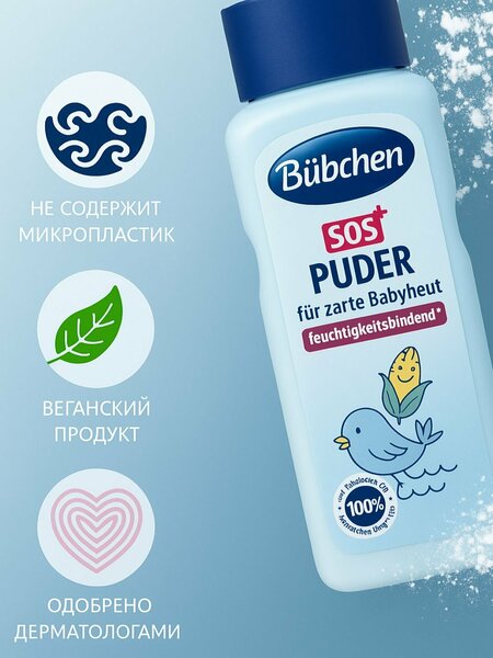 Bübchen присыпка SOS, 80 г Детская присыпка Bübchen SOS разработана специально для нежной и чувствительной кожи малышей. Она эффективно впитывает излишки влаги, предотвращает появление опрелостей, раздражения и зуда. Формула с натуральными компонентами, без ароматизаторов и красителей, подходит для ежедневного ухода с первых дней жизни. Преимущества: Быстро снимает раздражение и покраснение Поддерживает кожу сухой и здоровой Без парабенов, силиконов, красителей и отдушек Подходит новорождённым Способ применения: Наносите небольшое количество присыпки на чистую и сухую кожу малыша в области под подгузником. Используйте при каждой смене подгузника.