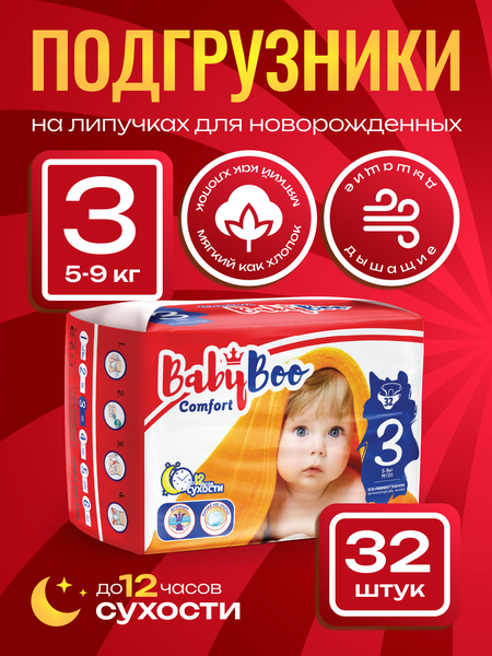 Подгузники BabyBoo "Comfort-3", 32шт, размер 3, для детей 5-9кг, гипоаллергенные
