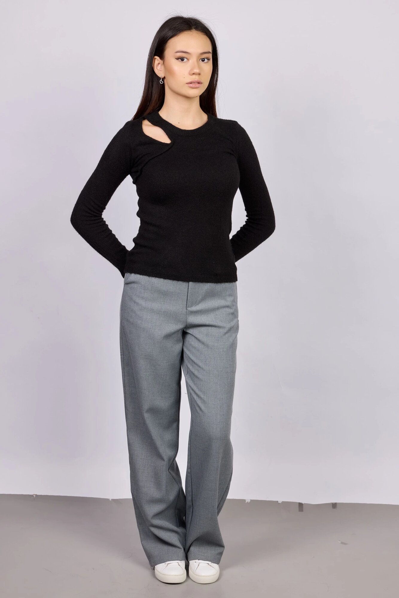Стильный джемпер полуприлегающего кроя с фигурным вырезом, добавляющим особый шарм и притягательность. Модель отлично будет смотреться в различных комбинациях с брюками, джинсами и юбками.