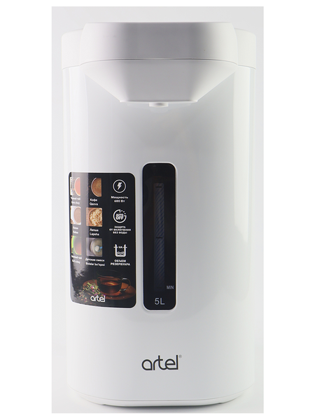 Термопот Artel ART-TE-3,8CN — это современное устройство, которое сочетает в себе функции электрического чайника и термоса, обеспечивая быстрый нагрев воды и длительное сохранение температуры. Благодаря объему резервуара 5 литров, модель идеально подходит не только для семьи, но и для офиса, небольшого кафе или рабочих помещений, где важно постоянное наличие горячей воды. Максимальная температура нагрева достигает 100°С, а функция поддержания температуры на уровне 85°С позволяет всегда иметь под рукой воду для приготовления чая, кофе, супов быстрого приготовления или детского питания. Встроенный режим повторного кипячения обеспечивает дополнительную очистку воды от бактерий, что делает напитки еще безопаснее. Artel ART-TE-3,8CN оснащен удобной сенсорной панелью с LCD-дисплеем, что делает управление простым и интуитивно понятным. Модель поддерживает несколько способов подачи воды: механический, электромеханический и автоматический — в том числе подача нажатием чашки на клапан. Это позволяет выбрать наиболее комфортный режим эксплуатации в зависимости от ситуации. Корпус выполнен из прочной комбинации нержавеющей стали и пластика, что гарантирует долговечность и устойчивость к повреждениям. Индикатор уровня воды позволяет контролировать остаток жидкости, а автоматическое отключение и защита от перегрева делают использование максимально безопасным. С потребляемой мощностью 680 Вт термопот отличается экономичностью и эффективностью. Его современный дизайн органично впишется в любой интерьер кухни или офиса, а большой объем бака избавит от необходимости частого долива воды. Максимальный объем: 5 литров Материал корпуса: Нержавеющая сталь/ Пластик Количество температурных режимов: 1 Доп. информации: Поддержание температуры 85°С, Звуковой сигнал, Режим повторного кипячения, Большой объем резервуара, Индикатор уровня воды Максимальная температура воды: 100°С Потребляемая мощность: 680 Вт LCD дисплей: Сенсорная панель Особенности: Поддержание температуры, Автоматическая подача воды, Автоматическое выключение
