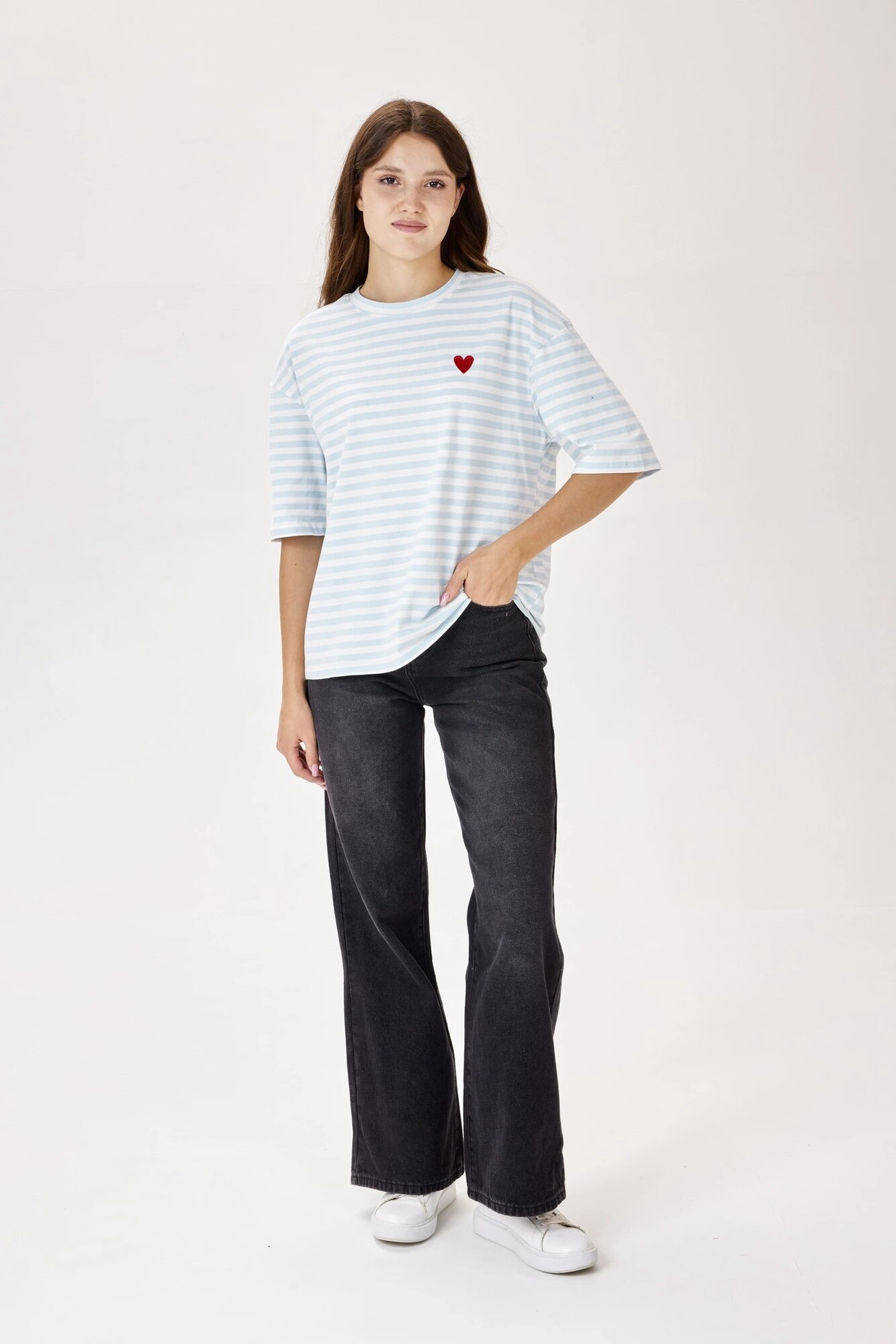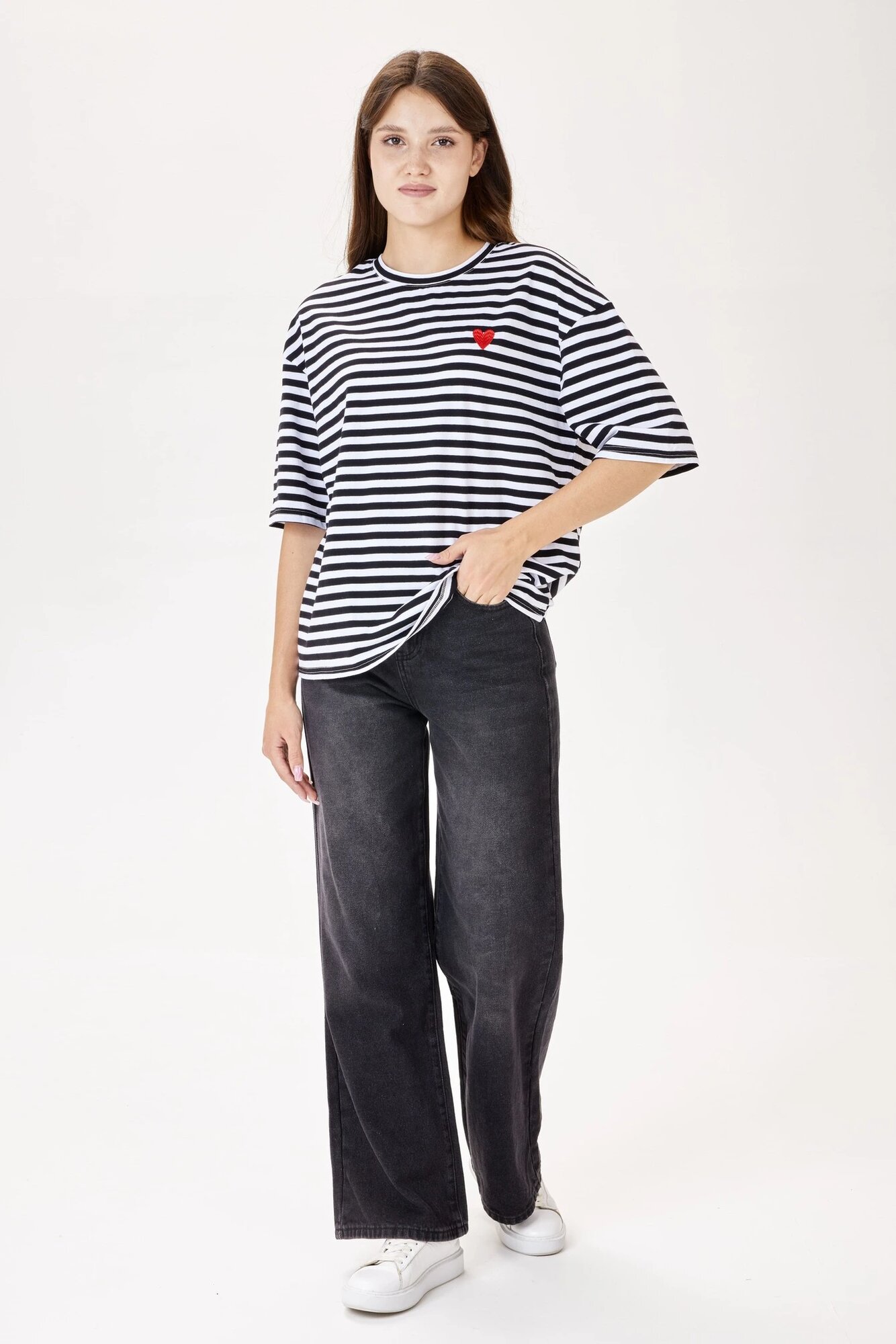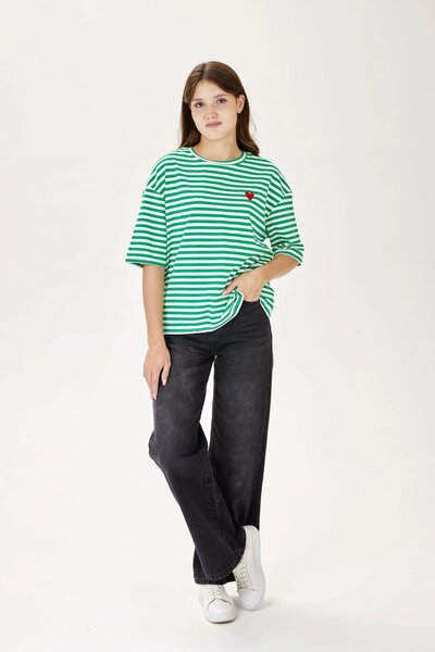 Приятная эластичная футболка в нежную полоску. Имеет круглый вырез и спущенную линию плеча с широкими рукавами – классические компоненты комфортной повседневной футболки. А на контрасте выделяется вышивка в виде красного сердца. Модель станет деликатным элементом образа для прогулки или отдыха.