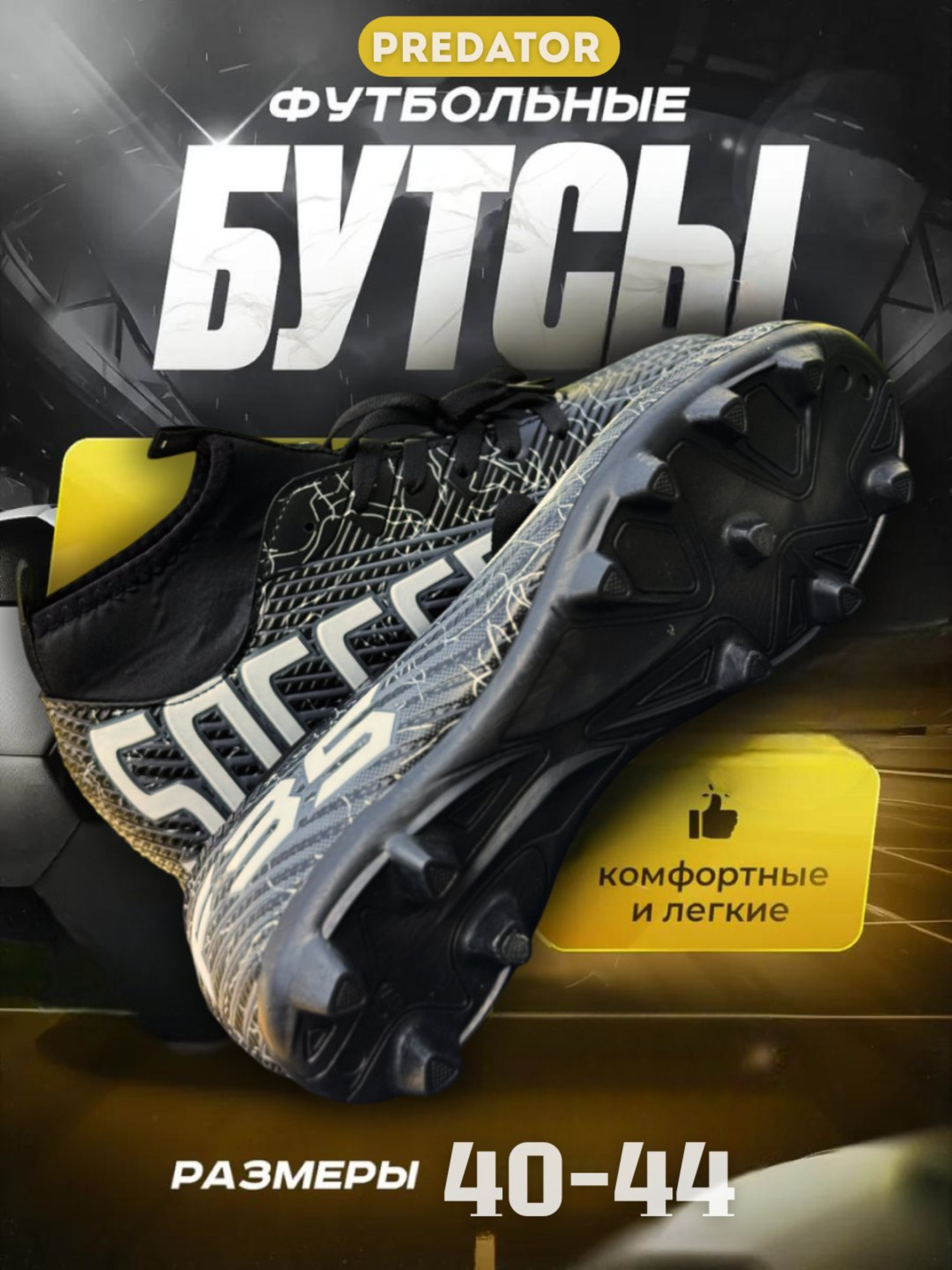 Подошва с NanoGrip™ технологией — забудьте о скольжении! Идеальное сцепление и полный контроль на любом покрытии Инновационный материал FlyFiber™ — сверхлёгкий, дышащий и плотно облегает ногу, как вторая кожа. Комфорт на протяжении всей игры. Амортизирующее покрытие Anti-Shock — поглощает удары и защищает стопу даже при самых жёстких столкновениях. Меньше боли — больше уверенности. Подошва с возвратом энергии — каждое движение усиливается, вы двигаетесь быстрее, не тратя лишнюю энергию. Эргономичный дизайн — идеально адаптируется к форме стопы. Даже после длительного матча ноги чувствуют себя легко Дизайн, вдохновлённый профи — стильный и броский. Вас заметят ещё до первого касания мяча. Ограниченная серия — только для тех, кто действительно живёт футболом. Созданы для победы — бутсы “Preadtor ” Вы не просто играете. Вы доминируете. Эти бутсы — не для всех. Это оружие победы для тех, кто выходит на поле не просто бегать, а брать контроль. “Predator” — выбор тех, кто знает, чего хочет и идет к этому быстро. Почему именно они? Технология NanoGrip — сцепление с полем, будто приклеены. Быстрые повороты, резкие старты — всё под контролем. Ультралёгкий материал FlyFiber™ — ощущение, будто вы босиком. Мгновенная адаптация к ноге, дышащая структура, без пота и натираний. Амортизирующее покрытие Anti-Shock — защитит стопу даже в самых жестких стыках. Проверено профи! Подошва с возвратом энергии — каждый шаг будто с дополнительным ускорением. Вы не теряете силу — вы её накапливаете. Это не просто обувь. Это — технология будущего. То, что вы надеваете сегодня, завтра станет легендой. важно: модель выпущена в ограниченном количестве. Только для тех, кто действительно играет в футбол, а не просто выходит на поле.