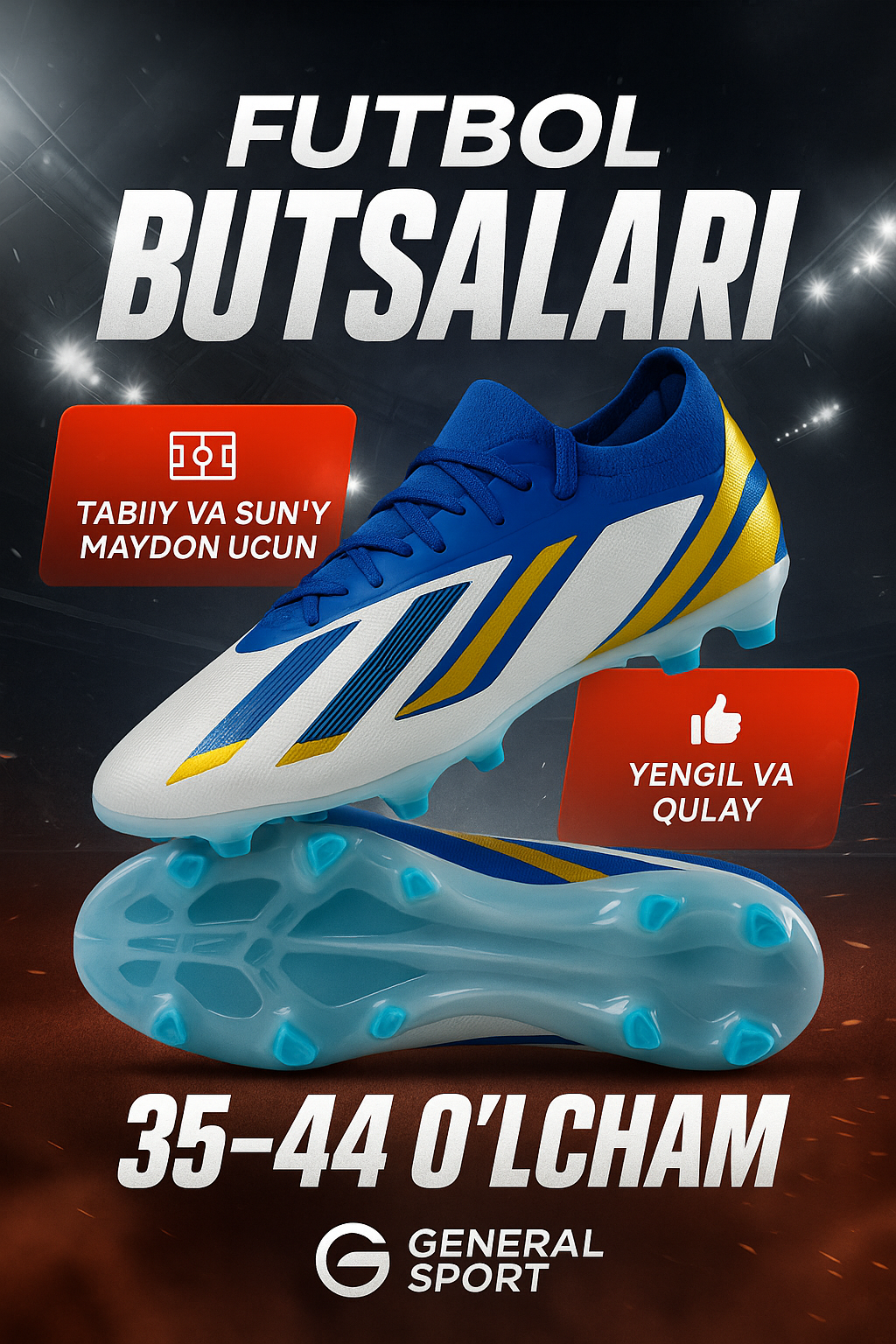 Футбольные бутсы General Sport — это лёгкая и удобная модель, созданная для профессиональных тренировок и игр. Подходят для натуральных и искусственных покрытий, обеспечивая устойчивость и комфорт при каждом движении. Верх изготовлен из прочной синтетической кожи и дышащего текстиля, что гарантирует отличную вентиляцию и плотное прилегание к ноге. Мягкая внутренняя подкладка защищает стопу от натираний, а надёжная шнуровка фиксирует ногу при активной игре. Подошва из эластичного TPR-каучука с шипами предотвращает скольжение и обеспечивает отличное сцепление с поверхностью поля. Ортотическая стелька из EVA-пены амортизирует нагрузку и сохраняет комфорт на протяжении всего матча. Размерный ряд 35–44 делает модель универсальной для подростков и взрослых игроков. Стильный дизайн и сочетание цветов подчёркивают современный спортивный характер обуви. Преимущества: Подходит для натуральных и искусственных полей Лёгкая и гибкая конструкция Противоскользящая подошва Дышащие материалы Профессиональный уровень комфорта Ортотическая стелька EVA Качественная синтетическая кожа Современный динамичный дизайн