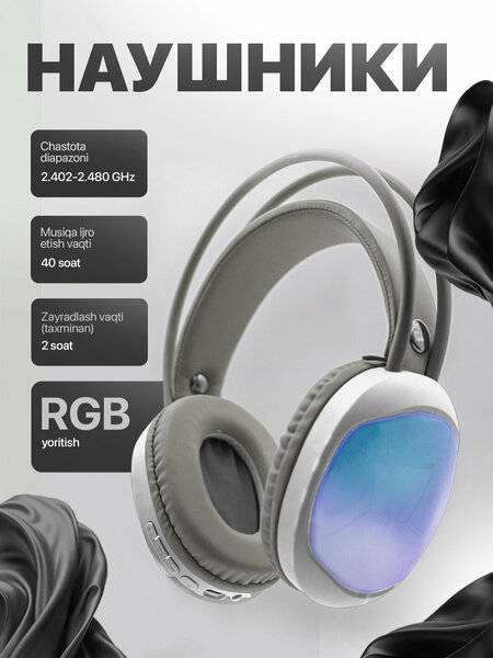 Технические характеристики: Диапазон частот: 2.402 – 2.480 ГГц ➤ Стандартный диапазон Bluetooth — стабильное и надежное соединение. Время воспроизведения музыки: до 40 часов ➤ Долгое время работы без подзарядки — идеально для путешествий и длительного использования. Время зарядки: примерно 2 часа ➤ Быстрая зарядка при высоком времени автономной работы. RGB-подсвеaтка: ➤ Яркая цветная подсветка на корпусе наушников — современный и стильный внешний вид, особенно популярен среди молодежи и геймеров. Дизайн: ➤ Мягкие амбушюры, двойное оголовье, кнопки управления на корпусе (громкость, переключение треков, пауза и т. д.) ✅ Преимущества: Длительная автономная работа — до 40 часов воспроизведения музыки. Современный и стильный дизайн — RGB-подсветка и мягкие материалы. Беспроводное подключение — свобода движения, никаких кабелей. Быстрая зарядка — всего за 2 часа. Совместимость с разными устройствами — смартфоны, планшеты, ноутбуки и др. Удобное управление — встроенные кнопки для полного контроля.