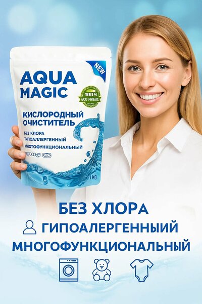 Эко-очиститель без хлора Aqua Magic — эффективно удаляет пятна, гипоаллергенный и безопасный для детских вещей. Подходит для стирки, мебели и текстиля. 100% экологично, 1 кг чистоты и свежести! O‘zbekcha variant: Xlorsiz kislorodli tozalovchi Aqua Magic – dog‘larni samarali yo‘qotadi va bolalar kiyimlari uchun xavfsiz. Kir, idish, mebel va matolar uchun mos. 100% tabiiy tarkib, 1 kg tozalik va yangilik!