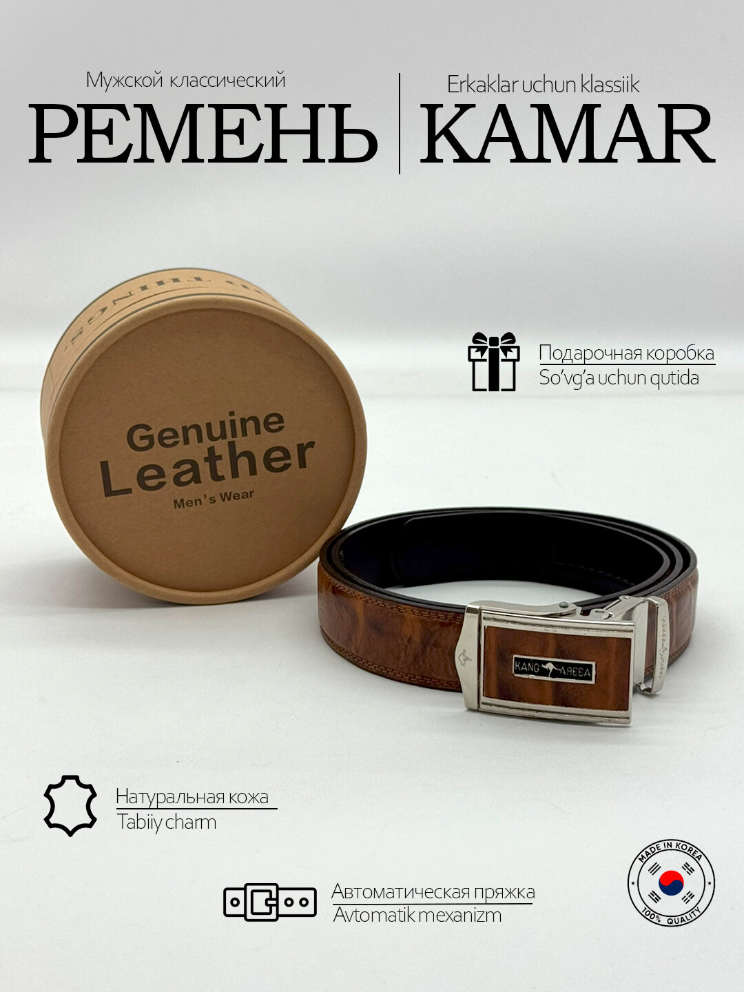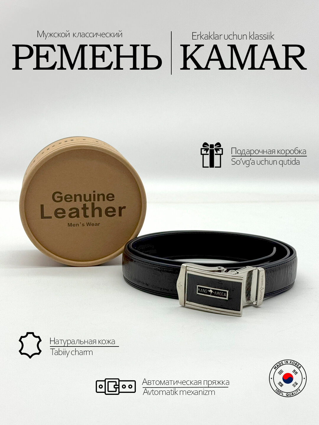 Мужские ремни KANG AREEA – стиль, качество и надежность KANG AREEA – это премиальные мужские ремни, созданные для тех, кто ценит безупречное качество, элегантность и долговечность. Каждый ремень – это гармония современных трендов и проверенных временем технологий производства. Ключевые особенности: ✔ Натуральная кожа – мягкая, износостойкая, с благородной фактурой, которая со временем становится только лучше. ✔ Прочные фурнитуры – массивные металлические пряжки (хромированные, матовые, с логотипом) обеспечивают надежную фиксацию и подчеркивают статусность. ✔ Универсальный дизайн – от строгих классических моделей до современных вариантов деталями. ✔ Идеальная посадка – анатомическая форма и регулируемая длина для максимального комфорта. Для кого: → Деловые мужчины – подчеркнут элегантность костюма. → Ценители casual-стиля – добавят образу харизматичности. → Как статусный подарок – упаковано в фирменную коробку. KANG AREEA – не просто аксессуар, а выражение вашего вкуса и уверенности!