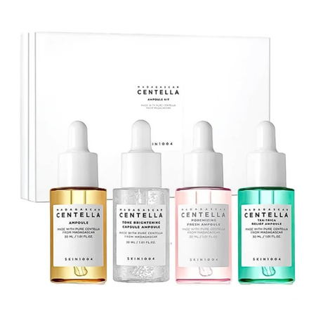 Набор сывороток с центеллой SKIN1004 Madagascar Centella Ampoule Kit — это 4 сыворотки из главных линеек бренда, которые направлены на решение разных задач: увлажнение, снятие раздражения, осветление и сужение пор. Каждая сыворотка основана на экстракте центеллы азиатской — успокаивающем компоненте, который не только борется с покраснением, но и поддерживает эластичность кожи. Набор в эстетичном оформлении станет отличным подарком для тех, кто хочет попробовать все серии SKIN1004. Комплектация: Ампула из 100% экстракта центеллы SKIN1004 Madagascar Centella Ampoule (30 мл) — это высококонцентрированное успокаивающее средство, которое ускоряет заживление ранок и повреждений, интенсивно увлажняет, устраняет раздражение, сухость, покраснение и воспаление, уменьшает акне. Главный и единственный компонент сыворотки — 100% экстракт центеллы азиатской, извлечённый из растения, произрастающего в экологически чистом районе Мадагаскара. Центелла из Мадагаскара содержит в 7 раз больше азиатикозида. Осветляющая капсульная ампула SKIN1004 Madagascar Centella Tone Brightening Capsule Ampoule (30 мл) осветляет, выравнивает тон и придаёт здоровое сияние, без раздражения и повреждения кожи. Успокаивает, увлажняет и смягчает. Лёгкая текстура с множеством капсул быстро впитывается, высвобождая активные компоненты. Средство, основанное на 77% экстракте центеллы, содержит растительный комплекс MadeWhite™, состоящий из мадекассосида, а также 4% ниацинамида, 2% транексамовой кислоты, стабильную форму витамина C и Aquaxyl®. Себорегулирующая ампула SKIN1004 Madagascar Centella Poremizing Fresh Ampoule (30 мл) подтягивает и укрепляет кожу, за счёт чего сужает расширенные поры и поддерживает их чистоту, предотвращает закупорку пор и появление жирного блеска. Формула основана на 50.47% экстракте центеллы и содержит 9 пептидов, розовую гималайскую соль, экстракт алоэ вера и пантенол. Успокаивающая ампула SKIN1004 Madagascar Centella Tea-Trica Relief Ampoule (30 мл) — SOS-средство от прыщей и воспалений, которое помогает в борьбе с акне, смягчает кожу, уменьшает покраснение и раздражение, отлично ухаживает за проблемной кожей. Основано на 55% экстракте центеллы, содержит гидролат и масло листьев чайного дерева, а также растительный комплекс Anti Sebum P, который предотвращает появление жирного блеска.