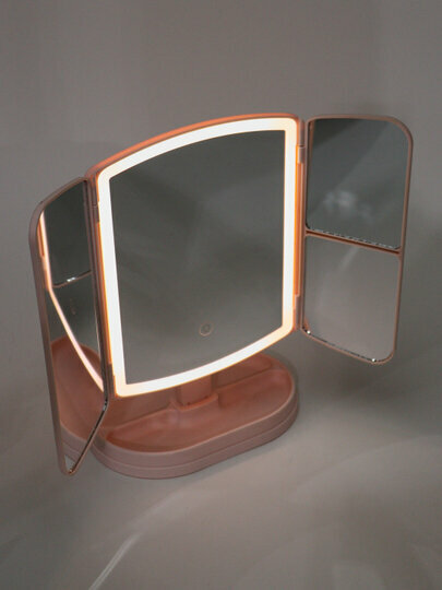 Стильное и удобное тройное зеркало с LED-подсветкой — идеальный помощник для макияжа и ухода за кожей. Зеркало оснащено тремя панелями для максимального обзора, сенсорным управлением и регулируемой яркостью света. Работает от USB. Доступно в двух цветах: белый и розовый. Характеристики: Сенсорное управление Три зеркальных панели Яркая LED-подсветка Складная конструкция Подключение по USB Размер: компактный, идеально подходит для стола