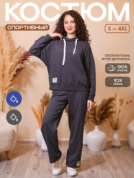 Женский спортивный костюм с капюшоном и карманами Универсальный и стильный спортивный костюм — идеальный вариант для прогулок, занятий спортом и повседневной носки. Выполнен из мягкого трикотажа - двунитка, который сочетает в себе комфорт, практичность и долговечность. Состав ткани: 90% хлопок, 10% лайкра — материал дышащий, приятный к телу и слегка тянется, не сковывая движений. Комплектация: худи с капюшоном и брюки. Особенности модели: Удобный капюшон с кулиской Вместительные карманы на худи и брюках Эластичные манжеты и пояс Мягкий, но плотный трикотаж — хорошо держит форму Не сковывает движения и подходит для любого типа фигуры Назначение: спорт, прогулки, поездки, домашний или уличный образ. Уход: машинная стирка при температуре до 30°С. Стиль и комфорт — в одном образе. Выбирай свой цвет и размер!