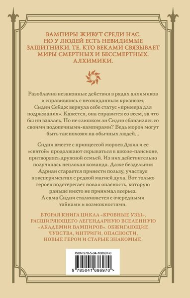 Продолжение цикла «Кровные узы», расширяющего легендарную вселенную «Академии вампиров». Оригинальная история, которую можно читать как самостоятельный цикл, а действующими лицами становятся не только вампиры и дампиры, но и алхимики — люди, которые пойдут на все, чтобы существование сверхъестественного оставалось в тайне. Сидни Сейдж — одна из них. Сидни сумела вернуть себе доверие собратьев-алхимиков, но надолго ли? Один неверный шаг, и ее могут заподозрить в том, что она слишком сблизилась со своими «подопечными» вампирами. Ведь они действительно прекрасно поладили. И это неестественно. Нельзя расслабляться рядом с ними, нельзя обмануться тем, что у них тоже есть чувства и свои слабости. Ей приходится балансировать на тонкой грани между долгом и тем, что кажется правильным здесь и сейчас. Вместе Сидни, морои и дампиры проводят эксперименты с редкой и загадочной магией духа, и даже бездельник Адриан пытается взять себя в руки. Но вскоре всем героям придется признать, что в этом мире, где вампиры реальны, могут ожить и другие мифы. Больше магии, тайн и опасностей!
