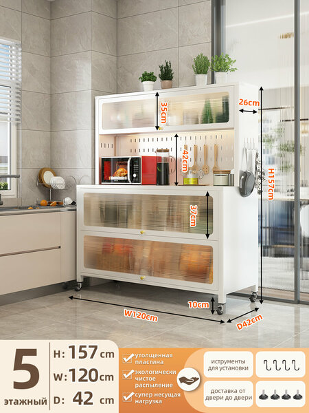 Пылезащитный многофункциональный кухонный шкаф для хранения Цельнометаллический корпус – не боится жира, легко чистится, экологичен и безопасен для здоровья. Многофункциональное разделение – всё кухонное принадлежности хранятся аккуратно и удобно. Внизу — бесплатные поворотные колёсики, легко перемещается, уборка без мёртвых зон.