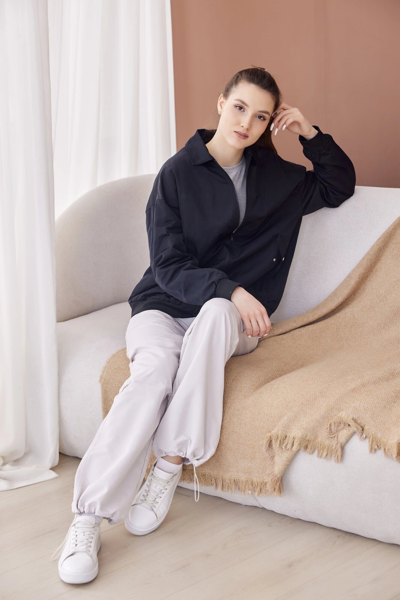 Легкая куртка с отложным воротником и двумя карманами с клапанами. Свободный крой и спущенные рукава придают комфорт. Универсальное решение для активного отдыха и прогулок. Отлично смотрится с кюлотами, брюками-карго, спортивными брюками, велосипедками.