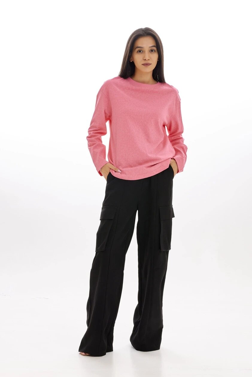 Приятный базовый лонгслив. Имеет круглый вырез и спущенную линию плеча с широкими рукавами. Модель станет лаконичным элементом образа для прогулки или отдыха.