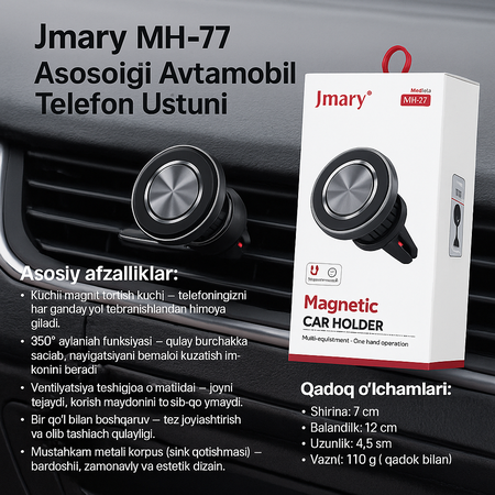 Магнитный автомобильный держатель для телефона Jmary MH-77 Основные характеристики: • Мощное магнитное поле — защищает телефон от любых дорожных вибраций. • Вращение на 360° — позволяет установить держатель под удобным углом и легко управлять навигацией. • Крепится на вентиляционную решетку — экономит место, не перекрывает обзор. • Управление одной рукой — легко устанавливается и снимается. • Прочный металлический корпус (цинковый сплав) — долговечный, современный и эстетичный дизайн.