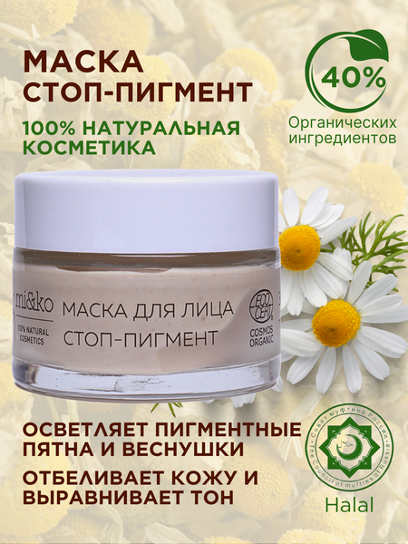 Маска MI&KO Стоп-Пигмент на 100% состоит из натуральных ингредиентов, 40% всех ингредиентов - органического сельского хозяйства (сертификат COSMOS ORGANIC). Супероружие от веснушек, пигментных пятен и возрастных пятен. Вы увидите заметно более ровный и здоровый тон вашей кожи уже после первого применения. Снижает синтез меланина, уменьшая проявление пигментных пятен Заметно улучшает цвет лица, придает коже сияние Увлажняет, питает и освежает кожу Заметно отбеливает кожу за 21 день Стимулирует микроциркуляцию и вывод имеющегося пигмента за счет масла примулы вечерней Оказывает омолаживающий и лифтинг-эффект благодаря эфирному маслу мирры Создает эффект «парадного лица» Маска отбеливающая для лица отлично работает курсом: 2-3 раза в неделю по вечерам. Днем в любую погоду применяйте SPF-крем. Работает с верхними слоями кожи: при глубокой пигментации используйте аппаратную коррекцию. Вся косметика MI&KO экологична, безопасна для здоровья и работает с проблемами, а не маскирует их. Более 80% ассортимента бренда MI&KO имеют органический сертификат COSMOSORGANIC. При производстве косметики мы НЕ используем: продукты нефтепереработки, минеральные (парафиновые) масла, детергенты SLS и SLeS, синтетические красители и отдушки, парабены, сырье животного происхождения, генномодифицированные продукты.