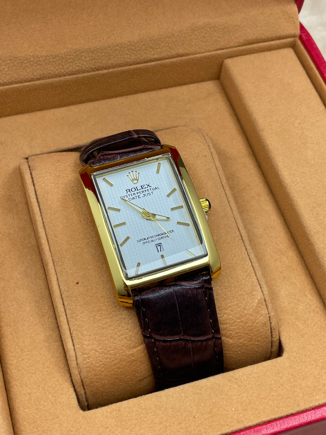 Rolex Classic – Мужские наручные часы с кварцевым механизмом Эта модель Rolex Classic выделяется прямоугольным корпусом золотистого цвета и белым циферблатом с узором в виде солнечных лучей. Золотистые стрелки и римские цифры придают часам элегантность и солидность. Черный ремешок из эко-кожи комфортно сидит на запястье. Кварцевый механизм обеспечивает точный ход, а функция отображения даты делает модель еще более практичной. Характеристики: Прямоугольный золотистый корпус Белый циферблат с солнечным узором Золотистые стрелки и римские цифры Кварцевый механизм с индикацией даты Черный ремешок из эко-кожи Прочное минеральное стекло Подходит для делового и повседневного стиля