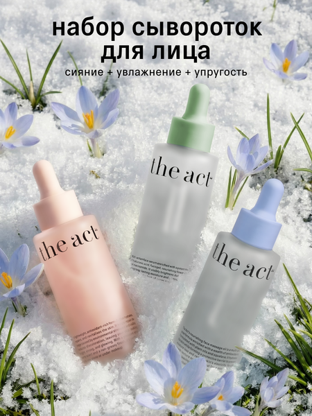 Здоровая кожа = увлажнение + сияние + упругость. The Act знаком с этой формулой и воплощает ее в виде набора из трех легендарных сывороток. Сыворотки разработаны с учетом особенностей всех типов кожи и усиливают эффект друг друга. Как сделать кожу сияющей? Весь секрет в сыворотке для сияния. Комплекс аминокислот стимулирует синтез церамидов липидного барьера кожи, напитывают ее влагой. Экстракт клубники улучшает цвет лица и стимулирует обновление эпидермиса, экстракты граната и сливы какаду оказывают выраженный антиоксидантный и антивозрастной эффекты. Ниацинамид восстанавливает и обновляет, способствует сохранению влаги и разглаживанию морщин, помогает от пигментных пятен на лице. Как сделать кожу увлажненной? Одна гиалуроновая кислота – хорошо, а три лучше! Именно столько и оказалось в составе увлажняющей сыворотки для лица The Act. Низкомолекулярная устраняет обезвоживание. Среднемолекулярная улучшает эпидермальное увлажнение. Высокомолекулярная образует защитную пленку, предотвращающую потерю влаги. Как подготовить кожу к массажу, сделать ее упругой и подтянутой? Задача для массажной сыворотки The Act. 5 масел в составе увлажняют, питают, снимают отечность, и, конечно, идеально подходят для комфортного скольжения во время массажа лица. Сыворотки для лица можно использовать по отдельности, а можно добавить к разным этапам ухода в течение дня, чтобы усилить и дополнить действие друг друга. Сыворотка для сияния идеальна в качестве легкой основы под макияж, нанесите ее во время утреннего ухода. Увлажняющую сыворотку добавьте к вечернему уходу, чтобы достичь глубокого увлажнения. А сыворотка для массажа лица – прекрасно впишется в ночной уход и во время процедуры массажа. Активные компоненты помогут коже оставаться в течение дня сияющей, здоровой и увлажненной. Набор сывороток для лица универсален и подходит в качестве ежедневного использования для мужчин, девушек и подростков с 14 лет.