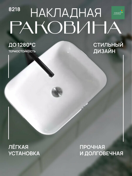 • Устойчивость к высоким температурам (до 1280°C) • Элегантный и стильный дизайн • Простая установка на столешницу • ✨ Лёгкость в уходе и очистке • Совместимость с различными тумбами Накладная раковина для ванной OSSO-8218 — идеальный выбор для стильного интерьера! Если вы хотите добавить изысканность и элегантность в свою ванную комнату, обратите внимание на накладную раковину Luminosso OSSO-8218. Она сочетает современный дизайн и высококачественные материалы, делая ваше пространство не только красивым, но и функциональным. ✨ Стиль и элегантность С гладкой, блестящей поверхностью и минималистичным геометрическим дизайном, OSSO-8218 идеально вписывается в современные интерьеры. Благодаря универсальному внешнему виду она гармонично сочетается с тумбами различных производителей, позволяя создать эстетически завершённое пространство. Прочность и долговечность Раковина изготовлена из керамики высочайшего качества, способной выдерживать температуру до 1280°C. Это обеспечивает её устойчивость к повреждениям, а также гарантирует сохранение первоначального вида на долгие годы. Лёгкость в уходе OSSO-8218 не впитывает неприятные запахи и отличается гладкой поверхностью, что делает её очень простой в очистке. Это особенно важно для поддержания гигиены в ванной комнате, ведь чистота и свежесть теперь достигаются без лишних усилий. Простота установки Разработанная для установки на столешницу, раковина монтируется быстро и легко, не требуя сложных монтажных работ. Это позволяет вам самостоятельно интегрировать её в интерьер ванной без необходимости вызова специалистов. Подходит для любого интерьера Благодаря своему современному и лаконичному дизайну, OSSO-8218 станет стильным дополнением как для классических, так и для современных интерьеров. Она привлечёт внимание и добавит вашей ванной комнате элегантности и уюта. Преобразите свою ванную с OSSO-8218! Эта раковина не только улучшит функциональность пространства, но и станет ярким акцентом в интерьере. Закажите OSSO-8218 уже сегодня и наслаждайтесь её качеством и стилем долгие годы!