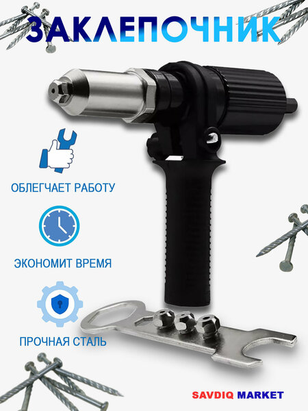 Насадка заклепочник для дрели и шуруповерта, черный, 2.4-4.8 мм: Инструмент, упрощающий процесс соединения! В современном мире строительства и ремонта, где скорость и надежность играют ключевую роль, насадка-заклепочник для дрели и шуруповерта становится незаменимым помощником. Этот компактный и эффективный инструмент превращает вашу дрель или шуруповерт в мощный заклепочный пистолет, значительно упрощая процесс соединения различных материалов Универсальность и практичность Насадка-заклепочник совместима с большинством стандартных дрелей и шуруповертов, что делает ее универсальным решением для широкого спектра задач. Благодаря диапазону заклепок от 2.4 до 4.8 мм, она подходит для работы с различными типами материалов, включая металл, пластик и кожу. Черный цвет придает инструменту стильный и профессиональный вид. Преимущества использования Использование насадки-заклепочника значительно экономит время и усилия по сравнению с традиционными методами соединения, такими как сварка или использование винтов и гаек. Она обеспечивает надежное и прочное соединение, устойчивое к вибрациям и нагрузкам. Компактный размер и легкий вес делают инструмент удобным в использовании и хранении. Области применения: Строительство и ремонт: соединение металлических профилей, монтаж кровли, установка водосточных систем. Автомобильный ремонт: крепление кузовных деталей, установка номерных знаков. Производство мебели: сборка металлических каркасов, крепление обивки. Рукоделие и хобби: изготовление металлических конструкций, создание декоративных элементов. В заключение, насадка-заклепочник для дрели и шуруповерта – это эффективный и доступный инструмент, который значительно упрощает процесс соединения материалов, экономя время и усилия. С Уважением команда Savdiq Market!