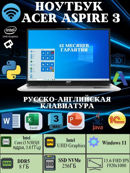 Ноутбук Acer Aspire 3 A315-510P - это мощный и надежный помощник в учебе, работе и развлечениях. Ноутбук оснащен 15,6-дюймовым экраном Full HD (1920x1080) с соотношением сторон 16:9 и матрицей TN. Это обеспечивает яркое и четкое изображение, а также широкие углы обзора. Аппаратная часть ноутбука включает в себя процессор Intel® Core™ i3-N305 (13-е поколение) с 8 ядрами и 8 потоками, который способен работать на частоте до 3,80 ГГц. 8 ГБ оперативной памяти LPDDR5-5200 МГц обеспечивают быструю и плавную работу. Для хранения данных предусмотрен SSD-накопитель емкостью 256 ГБ, который обеспечивает быстрый доступ к файлам и программам. Ноутбук оснащен видеокартой Intel UHD Graphics, что позволяет комфортно работать с графическими приложениями и просматривать видео. Устройство оснащено Wi-Fi 5 (802.11 ax) и Bluetooth 5.1 для быстрого и стабильного подключения к интернету и другим устройствам. В ноутбуке предусмотрены разнообразные порты: 1x USB 3.2 Gen1, 1x USB 3.2 Gen1, 1x HDMI, 1x USB 3.2 Gen 2 Type-C. Это позволяет подключать различные устройства и аксессуары. Аккумулятор емкостью 40 Втч обеспечивает длительное время работы, а 3-элементный литий-ионный аккумулятор гарантирует надежность и долговечность. Аудиосистема с двумя динамиками обеспечивает качественный звук, а веб-камера с разрешением FHD 720p позволяет проводить видеозвонки и конференции. Ноутбук Acer Aspire 3 A315-510P имеет размеры 35,63 x 23,53 x 1,90–2,00 см и весит всего 1,9 кг, что делает его легким и удобным для переноски.