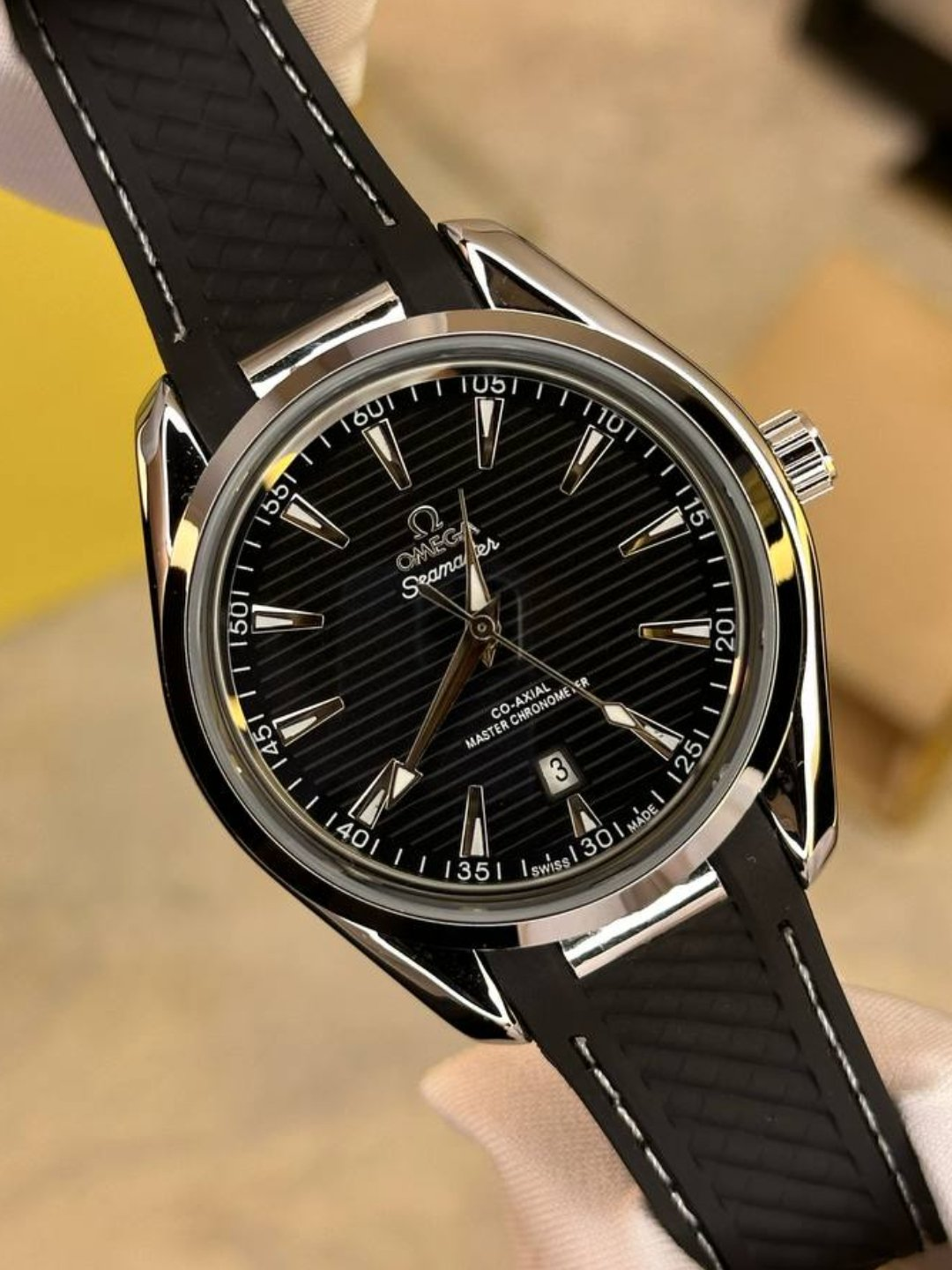 Omega Seamaster Aqua Terra — это мужские часы, которые гармонично сочетают в себе спортивный характер и элегантный дизайн. Белый циферблат с горизонтальными линиями символизирует морскую тематику и придает часам уникальный вид. Крупные черные метки и стрелки с люминесцентным покрытием обеспечивают отличную читаемость в любое время суток. Корпус изготовлен из высококачественной нержавеющей стали с зеркальной полировкой, что делает модель прочной и долговечной. Черный каучуковый ремешок с текстурой под кожу придает часам универсальность: они одинаково стильно смотрятся как с повседневным костюмом, так и с деловой одеждой. На 6 часах расположено окошко даты, что добавляет практичности. В основе часов — механизм Omega Co-Axial Master Chronometer, сертифицированный METAS. Это гарантирует максимальную точность, устойчивость к магнитным полям и долговечность. Часы соответствуют высоким швейцарским стандартам качества и идеально подойдут для уверенного мужчины, ценящего комфорт, престиж и надежность.