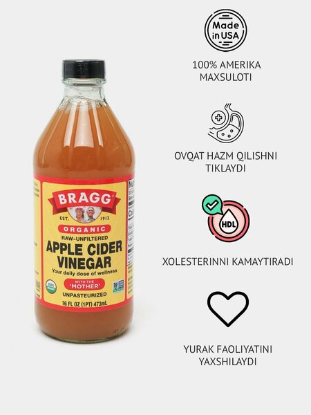 Bragg уксус яблочный органический — это натуральный, нефильтрованный и непастеризованный яблочный уксус с так называемой «матерью уксуса» (the Mother), содержащей полезные ферменты, белки и бактерии. Производится из органических яблок методом естественного брожения. Основные характеристики: 100% органический, с сертификацией USDA Organic Содержит «матерь уксуса» — живую культуру ферментации Без ГМО, глютена и искусственных добавок Подходит для веганов Польза: Поддержка пищеварения Баланс уровня сахара в крови Детоксикация организма Укрепление иммунной системы Может способствовать снижению веса при регулярном употреблении Как использовать: Добавлять в салаты и маринады Разводить с водой и пить (обычно 1–2 ч. л. на стакан воды) Использовать в качестве тоника для кожи или ополаскивателя для волос Bragg — это один из самых известных брендов натуральных продуктов в США с более чем вековой историей. Их яблочный уксус ценится за высокое качество и эффективность.