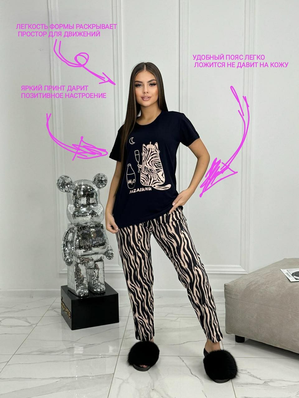 леопардовый, черный, Леопардовые брюки + футболка