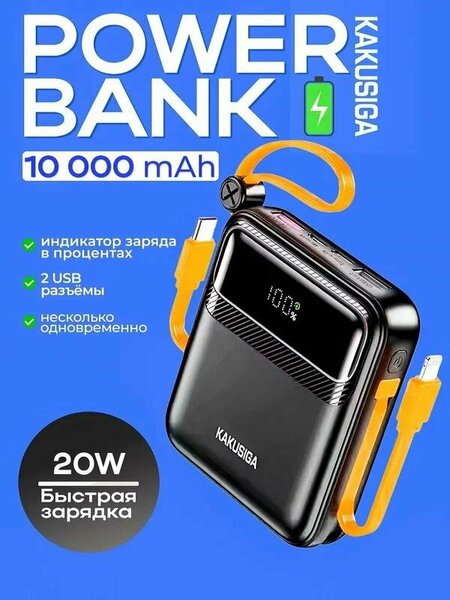 Портативное зарядное устройство Kakusiga KSC-1084 – 10 000 мАч, быстрое и надежное питание! Kakusiga KSC-1084 – это компактный и мощный повербанк, который обеспечит вашу технику энергией в любое время и в любом месте. Основные характеристики: Емкость: 10 000 мАч – заряжайте ваш смартфон и другие гаджеты несколько раз. зарядка: Выходная мощность 5V/2A для эффективного заряда. Два USB-выхода: Позволяет заряжать два устройства одновременно. Порты для зарядки: Type-C и Micro USB – универсальные и удобные разъемы. LED-индикатор: Отображает уровень оставшегося заряда. Система защиты: Предотвращает перезаряд, перегрев и короткое замыкание. Легкий и компактный: Удобно носить с собой. Материал: Прочный и огнестойкий пластик ABS + PC. Для кого подойдет? Тем, кто много путешествует и ведет активный образ жизни. Владельцам нескольких гаджетов, которым нужна постоянная подзарядка. Тем, кто ценит надежность и качество. Kakusiga KSC-1084 – надежный источник энергии для вашего комфорта!