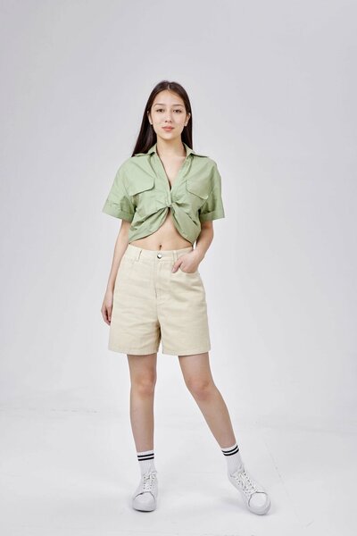 Укороченная рубашка с глубоким V-образным вырезом, карманами с клапанами и драпировкой, открывающей живот. Модель идеально впишется в гардероб любительниц стильных и смелых образов.