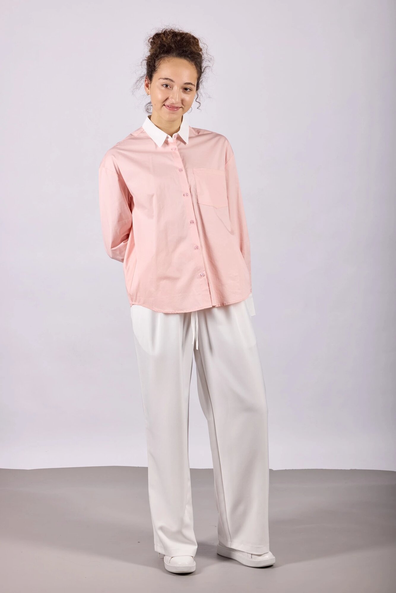 Базовая рубашка свободного кроя с акцентными вставками на воротнике и манжетах — стильная и универсальная модель, которая добавляет изысканности и оригинальности классическому образу. Отлично сочетает комфорт и элегантность, идеально подходя как для повседневных, так и для более формальных луков.