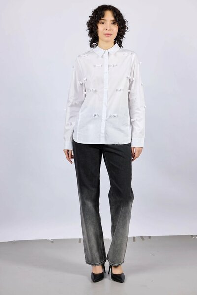 Базовая рубашка свободного кроя, декорированная маленькими бантами в тон — стильная и нежная модель, которая добавляет женственности в классический образ. Отлично сочетается с различными нижними частями, создавая гармоничные и стильные образы для повседневного носки.