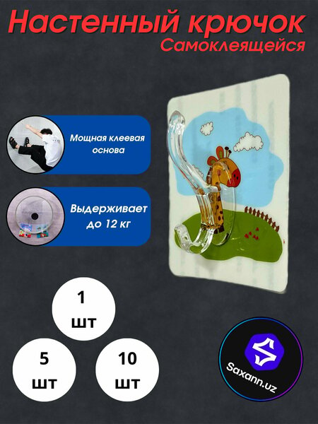 Добро пожаловать в магазин SAXANN. UZ1. Мощная клеевая основа: Крючок имеет прочную клеевую основу, которая позволяет выдерживать до 12 кг без необходимости сверления или использования гвоздей. Это делает его удобным для различных поверхностей, не повреждая стены. 2. Преимущества: • Без сверления: Установка не требует инструментов и не оставляет следов или отверстий. • Всегда чисто и аккуратно: Не оставляет остатков клея, сохраняя чистоту вокруг. • Водостойкий: Подходит для влажных помещений, таких как ванная комната, так как сохраняет клеевую силу при воздействии влаги. 3. Варианты дизайна и размеров: • Доступны различные дизайны: цветочные узоры, изображения животных и другие декоративные рисунки. • Размер основания каждого крючка: 7,5 см x 8,5 см. • Доступны наборы из 1, 5 и 10 штук.