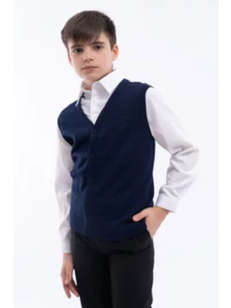 Жилет для вашего мальчика . Классическое сочетание и строгий вид придает данная комбинация вашему ребенку. Она выполнена из высококачественного хлопка , что позволяет коже дышать и не перегреваться не доставляя дискомфорта на целый день. В таком жилете удобно двигаться , он не сковывает движения и слегка ощущается на теле ребенка. Жилетка представлена в самых базовых цветах, которые позволят носить ее не только на мероприятия , но и в школу под брюки. Этот жилет сшит из натуральных нитей, идеально подойдет для стильной девочки или мальчика, которые хотят выглядеть модно и оригинально. Он украшен в тон трикотажной отделкой по V-образному вырезу, создавая уникальн дизайн, по пройме рукава и внизу. Тёмно синий цвет делает эту безрукавку элегантной и при этом практичной для школы или повседневного образа. Стильная жилетка с V-образным вырезом не стесняет движение, что делает ее комфортной на весь день. Она легко сочетается с любыми блузами, рубашками или кофточками. Эта однотонная жилетка подчеркнет индивидуальность молодой модницы или модника.