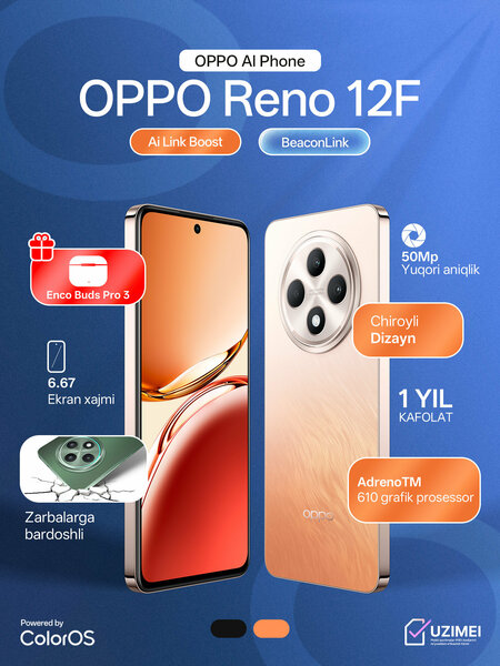 {"widgets":{"@light/ProductM2bEdoOnlyBadge":{"/content/page/fancyPage/defaultPage/m2bEdoOnlyBadge":{"wrapperProps":{"margins":{"top":"2"}},"isM2bEdoOnlyEnable":false}}},"meta":{"/content/page/fancyPage/defaultPage/m2bEdoOnlyBadge":{"name":"@light/ProductM2bEdoOnlyBadge"}},"collections":{"views":{"defaultOffer":"vi_5992990393650310419_bi_3930731637470056359"},"viewItem":{"vi_5992990393650310419_bi_3930731637470056359":{"id":"vi_5992990393650310419_bi_3930731637470056359","composeId":"5992990393650310419","buyOptionId":"bi_3930731637470056359"}},"buyOption":{"bi_3930731637470056359":{"id":"bi_3930731637470056359","title":"Смартфон OPPO Reno12 F 8/256GB, Amber Orange (оранжевый), Dual Nano sim, 1 год гарантии + наушники","offerId":"H9UaAQXqhJdxI1ziJf7GTQ","slug":"smartfon-oppo-reno12-f-cph2687-kamera-50-mp-amoled-nfc-oranzhevyy","trackingLinks":{"cpa":"/T_L5FjZGgMWV87F4ntv41zE0J-S3","promotionUrl":"/gAMK22W5Y-YEOPBlyzGF3GCz7ne7"},"skuId":"4316906454","productId":"1097087392","categoryId":"91491","navnodeId":"34512430","departmentId":"54440","showUid":"17736659143763864904106001","counterStep":1,"minimum":1,"maximum":12,"price":{"value":2899000,"currency":"UZS"},"vendorId":"6278641","feeShow":"OTNDnItfwRMlLJby2gHopXNCPUKEbVLiasRnG_G2Pvthq9uJrQHjj3ELfzU5_lewA8am3aM70SOHAwwP2GiI6phIBJb1eH85jsivxh8qqyhQrsII0UE0p6qTsDYlliKTWYE8JBEYrwOGWL-WLg19XUlHAKw-eTMSBsXBpS6TcOhduiO86AdQ-Ixy6m1jL89RjqknTtTjVClDkiKa0wVrVuJ6Uq7Pxu5jYXkQgjL4xYdVr6sb68H_30RjD1dNykzW0Apoc39zZsygCzNZUNNY2_XhY3EM7VsAy6VHC-2wKPvEMLdZneXHiQ,,","feedId":"53319918","feedOfferId":"53319918.CPH2687","shopId":"431782","supplierId":"205258963","businessId":"193620084","supplierName":"OPPO official store","businessName":"OPPO official store","hasAnySize":false,"hasAnyDelivery":true,"benefitTypeCode":"waremd5","basePrice":{"value":4710000,"currency":"UZS"},"flags":["isFbs","isOnDemand","isPartialCheckoutAvailable"],"analytics":{"warehouseId":"1779727","paymentType":"ANY","atSupplierWarehouse":true,"paymentMethodTypes":["BY_CARD_ONLINE","BY_CARD_TO_COURIER","IN_CASH"],"deliveryOptions":[{"deliveryType":"delivery","fromDate":1773925114,"toDate":1773925114,"priceInfo":{"value":0,"currency":"UZS"}},{"deliveryType":"pickup","fromDate":1773925114,"toDate":1773925114,"priceInfo":{"value":0,"currency":"UZS"}},{"deliveryType":"pickup","fromDate":1773925114,"toDate":1773925114,"priceInfo":{"value":0,"currency":"UZS"}},{"deliveryType":"delivery","fromDate":1773925114,"toDate":1773925114,"priceInfo":{"value":0,"currency":"UZS"}}],"shopSku":"CPH2687","placementType":"3P","ownMarketPlace":true,"shopSlug":"yandex-market","yandexBnplInfo":{"enabled":true},"hypeBadge":{"hasBadgeRare":false}},"deliveryType":"DELIVERY","imageMeta":{"namespace":"mpic","groupId":3590777,"key":"2a0000019c66909dd44c0504f92b14716d0a"}}},"market2Business":{"current":{"id":"current","isM2b":false}}}}