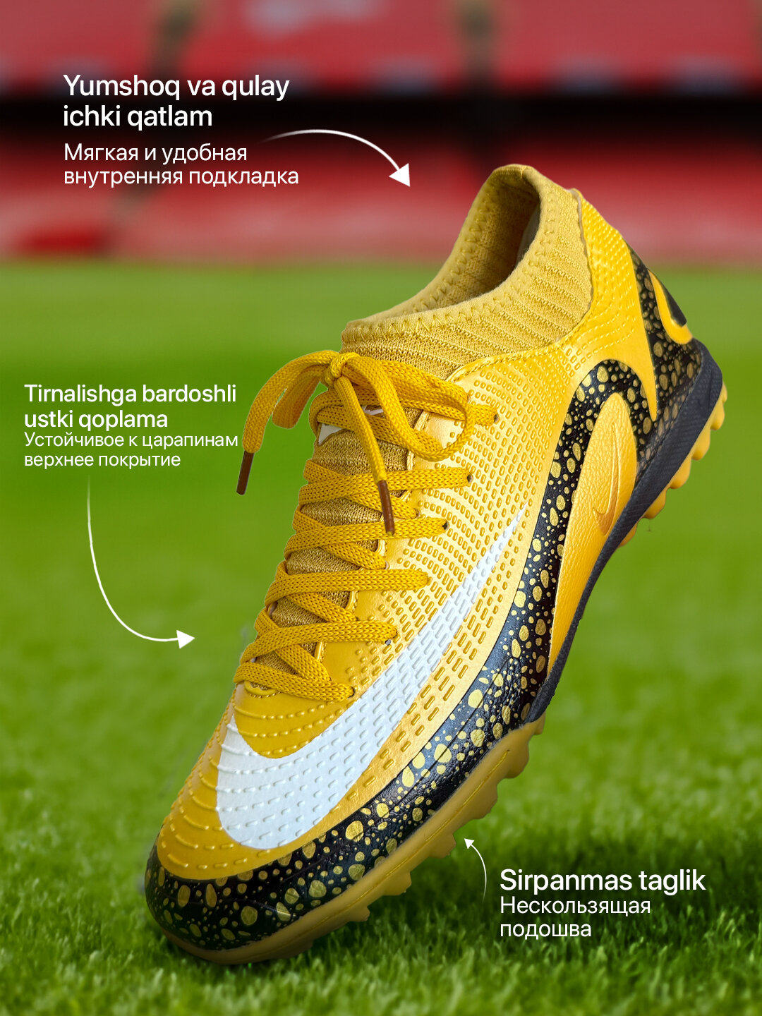 Размер от 40 до 45 Идеально подходит для фудбола и фудзала Вид бутс: футбольные, сороконожки Высокие манжеты и полуманжеты для надежного захвата ног Новая модель – современный и стильный продукт Футбольные бутсы - это специальная обувь, созданная для игры в футбол. Они обеспечивают комфорт и безопасность на футбольном поле благодаря своим особенностям. Бутсы с шипами обладают прочной подошвой с хорошей амортизацией, что позволяет снизить утомляемость ног во время тренировок и матчей. Они имеют удобную шнуровку, которая обеспечивает плотное прилегание к стопе, что помогает избежать повреждений и поддерживает надежную фиксацию стопы. Бутсы также имеют специальные шипы или ребристую подошву, которая увеличивает сцепление обуви с газоном и обеспечивает лучшую маневренность на поле. Они изготовлены из прочных синтетических материалов, что обеспечивает долговечность и позволяет чувствовать мяч лучше. Бутсы будучи высокими носками, плотно прилегают к ноге, и главное, не доставляют дискомфорта при выполнении упражнения. Бутсы футбольные - это неотъемлемая часть экипировки каждого футболиста, что позволяет играть на высоком уровне и достигать своих спортивных целей. Специальные бутсы, созданные для настоящих победителей! В них Вы сможете точно контролировать мяч и легко передвигаться по полю. Эти бутсы сделаны из высококачественной микрофибры, которая позволяет бутсам облегать Вашу ногу, словно вторая кожа, обеспечивая максимальный комфорт во время игры. Твердая резиновая подошва с множеством шипов обеспечивает необходимое сцепление с игровым полем, гарантированная превосходная износостойкость и лучшая амортизация, которые помогают отлично распределить нагрузку на ногу. Эти бутсы имеют дополнительную удобную манжету для защиты от натирания и повреждения. Шнурки помогают точно фиксировать и регулировать посадку бутс, придавая Вам уверенности и устойчивости в движениях. Игровая обувь профессионального уровня -классическая модель бутс в стильной цветовой гамме. Футзалки имеют прочный, эластичный и комфортный верх, созданный из высококачественных синтетических материалов, Нейлоновая подкладка отличается хорошей воздухопроницаемостью и высокой прочностью и долговечностью. При производстве внутренних стелек используется пена EVA, которая обладает хорошей амортизацией и способствует комфортному положению стопы. Подошва бутс выполнена из высокопрочной резины, что замедляет износ игровой обуви и продлевает ее срок службы. Созданный в подошве ряд гибких, эргономичных линий, способствует плавному перекату стопы от пятки к носку при каждом шаге. Дизайн бутс сороконожек стильный и современный, соответствующий последним модным тенденциям. Вы будете выглядеть настоящим профессионалом на любом футбольном поле! Купите сейчас и почувствуйте разницу!