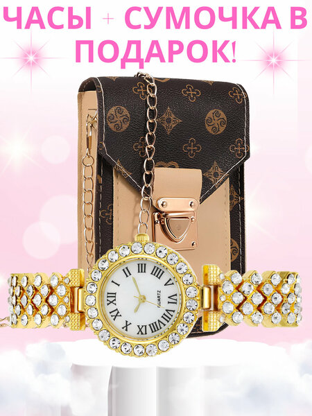 ЧТО ВНУТРИ НАБОРА: 1. Наручные часы: – Классический дизайн с римскими цифрами – Инкрустация сверкающими кристаллами – Кварцевый механизм — точный и долговечный – Подходят к любому стилю: от повседневного до вечернего 2. Мини-сумочка: – Элегантная модель на цепочке – Подходит для телефона, ключей, карт и других мелочей – Стильный акцент в образе – Замочек-застёжка для безопасности ПРЕИМУЩЕСТВА: ✔ Разнообразие цветов — выбирайте по вкусу ✔ Универсальный подарок для женщин любого возраста ✔ Эффектный комплект по доступной цене ✔ Готовое решение для подарка — не нужно искать отдельно ПОДХОДИТ ДЛЯ: Подарка на 8 марта, день рождения, юбилей Офисного стиля Вечернего выхода Стильных фото в Instagram ХАРАКТЕРИСТИКИ: • Тип механизма: кварцевый • Материал часов: металл/сплав • Материал сумки: экокожа • Упаковка: подарочная • Цвета в ассортименте
