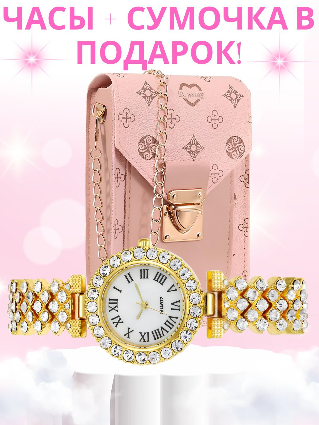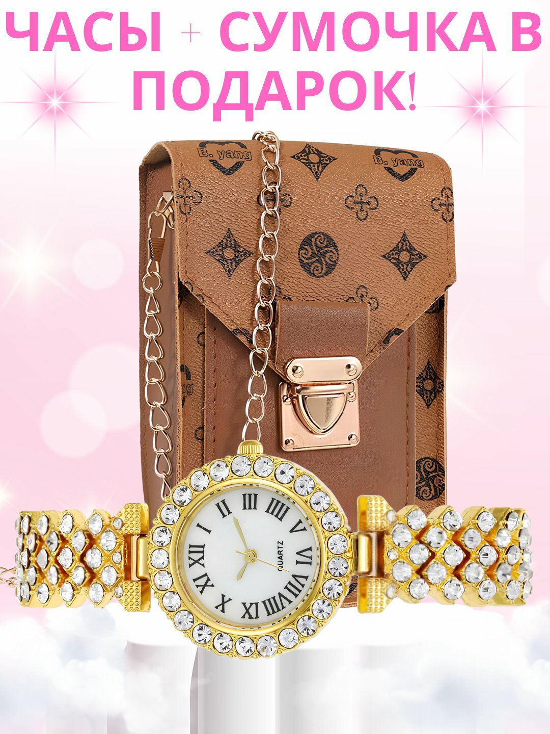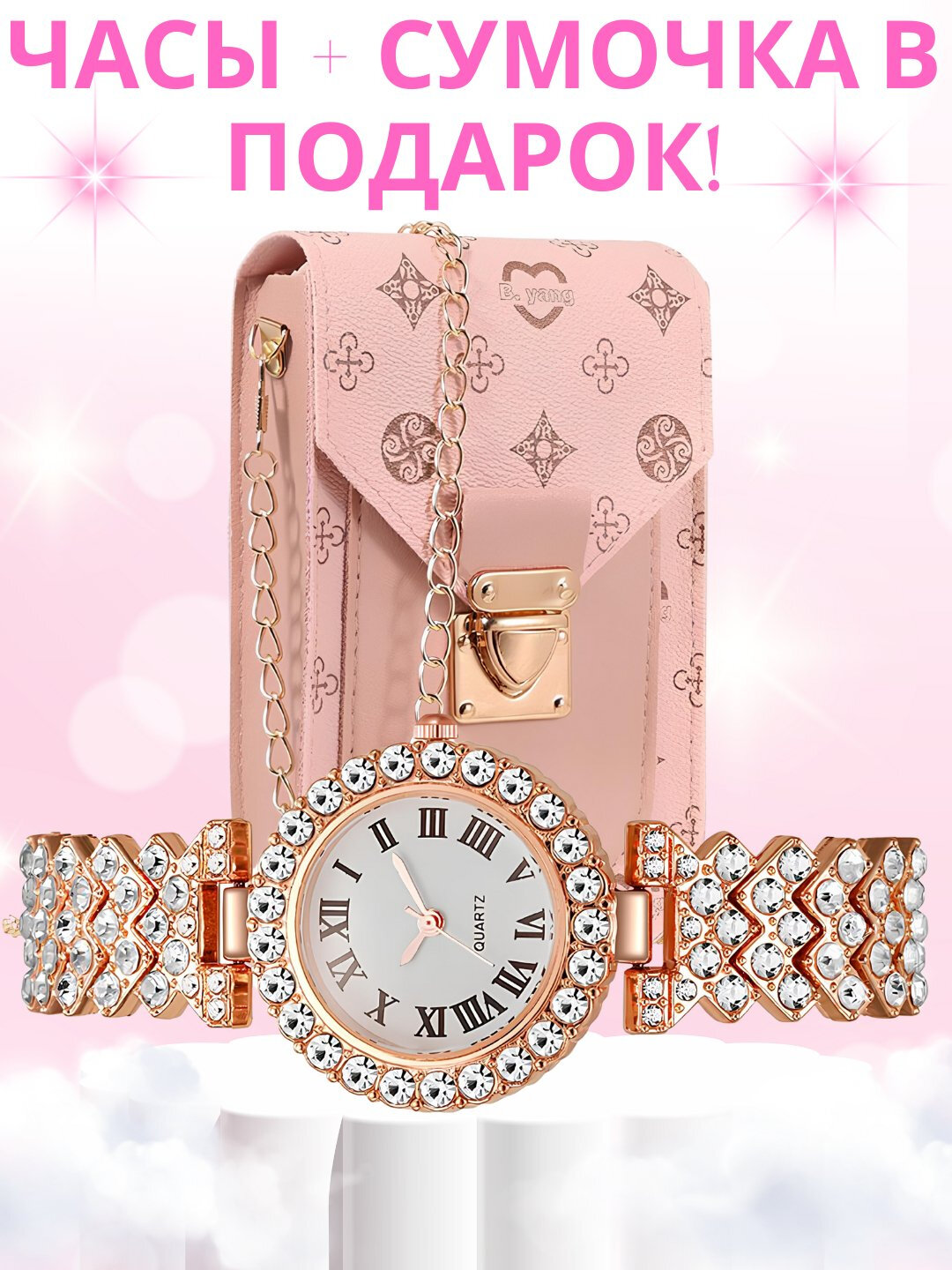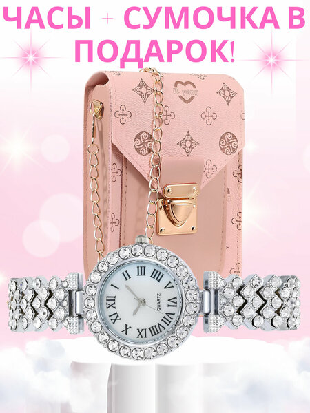 ЧТО ВНУТРИ НАБОРА: 1. Наручные часы: – Классический дизайн с римскими цифрами – Инкрустация сверкающими кристаллами – Кварцевый механизм — точный и долговечный – Подходят к любому стилю: от повседневного до вечернего 2. Мини-сумочка: – Элегантная модель на цепочке – Подходит для телефона, ключей, карт и других мелочей – Стильный акцент в образе – Замочек-застёжка для безопасности ПРЕИМУЩЕСТВА: ✔ Разнообразие цветов — выбирайте по вкусу ✔ Универсальный подарок для женщин любого возраста ✔ Эффектный комплект по доступной цене ✔ Готовое решение для подарка — не нужно искать отдельно ПОДХОДИТ ДЛЯ: Подарка на 8 марта, день рождения, юбилей Офисного стиля Вечернего выхода Стильных фото в Instagram ХАРАКТЕРИСТИКИ: • Тип механизма: кварцевый • Материал часов: металл/сплав • Материал сумки: экокожа • Упаковка: подарочная • Цвета в ассортименте