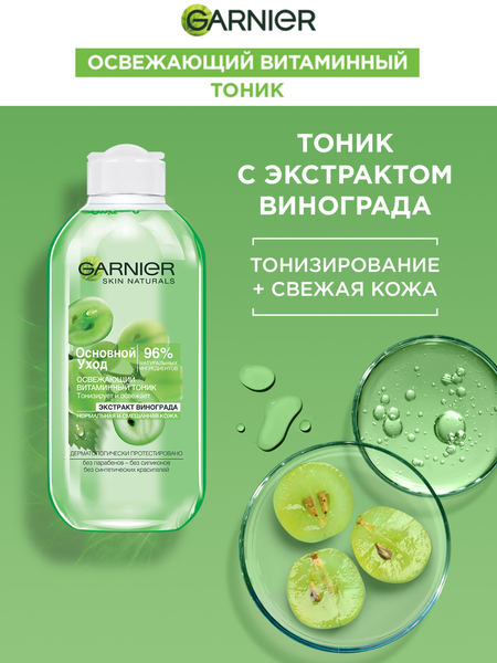 Тоник Garnier "Основной уход" с экстрактом винограда - это эффективное средство для ухода за кожей лица, которое обеспечивает глубокое увлажнение и питание, а также способствует сохранению молодости и красоты вашей кожи. Основной ингредиент тоника - экстракт винограда, который богат антиоксидантами и другими полезными веществами. Благодаря этому, тоник Garnier помогает бороться с признаками старения, улучшает текстуру кожи и придает ей здоровый вид. Тоник Garnier "Основной уход" имеет удобный объем 200 мл, что позволяет использовать его экономично и на протяжении длительного времени. Тоник Garnier "Основной уход" подходит для всех типов кожи, включая чувствительную и склонную к сухости. Он не содержит спирта и парабенов, что делает его безопасным и гипоаллергенным средством для ежедневного использования. Выбирая тоник Garnier "Основной уход" с экстрактом винограда, вы получаете качественный продукт от известного бренда, который заботится о вашей коже и помогает сохранить ее молодость и красоту.