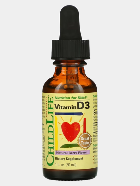 Основы Питание для детей Великолепный вкус Биологически активная добавка Кошерное парве Без глютена, алкоголя и казеина ChildLife® Витамин D3 создан специально для младенцев и детей. Не содержит спирта, натуральные ингредиенты, оптимальное усвоение и великолепный натуральный ягодный вкус. Совет для здоровья: Недавно Американская академия педиатрии удвоила свои рекомендации по количеству витамина D, которое должны получать все дети. Эти рекомендации стали результатом новых исследований, отражающих многочисленные преимущества витамина D, включая поддержку здоровья костей и здоровой иммунной системы. Предлагаемое использование Младенцы 0–12 месяцев: 6 капель в день. Дети от 1 года: 8 капель в день. Хорошо встряхнуть перед использованием. Давайте сразу или смешивайте с любимым напитком вашего ребенка. Другие ингредиенты Органический растительный глицерин, деионизированная вода, натуральный ягодный ароматизатор, витамин Е (антиоксидант). Предупреждения Хранить в прохладном сухом месте.