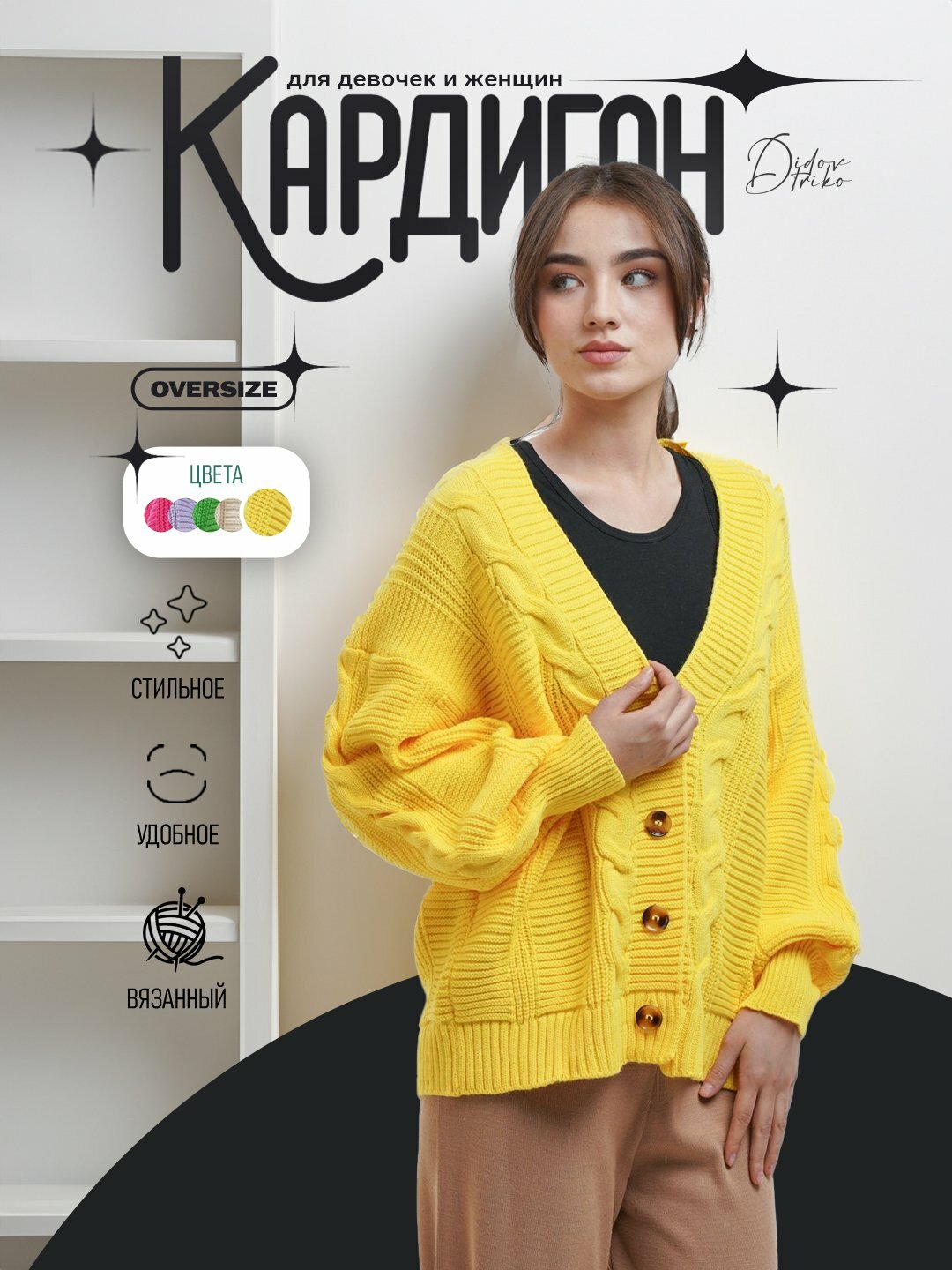 Мягкий, стильный, вязаный кардиган на 4 пуговицах Идеален для любой погоды Ширина - 50-52 см Вязанный кардиган 4 пуговицы V-образный вырез с отсутствием воротника и длинные прямые рукава Высота - 60 см Негабаритный – (от 42 / до 52) размер Этот вязаный оверсайз-кардиган Didov Triko — идеальный выбор для создания стильного и комфортного образа. Кардиган с четырьмя пуговицами выполнен из мягкого трикотажа, который приятно ложится на кожу и идеально подходит для любых погодных условий
