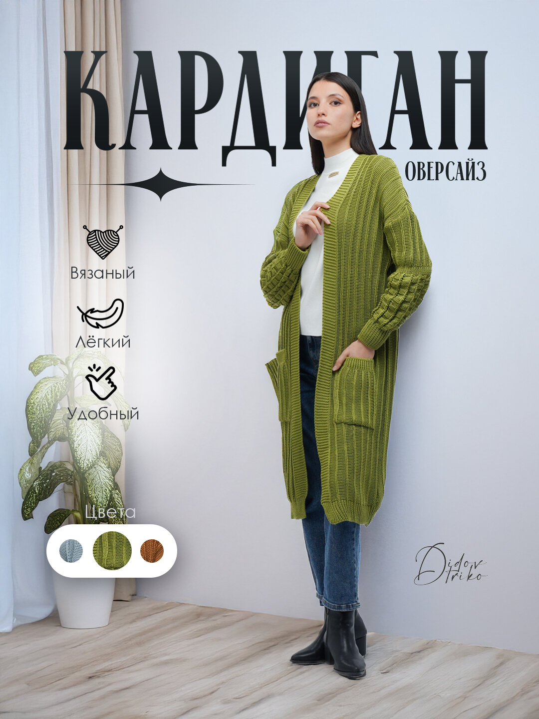 Вязанный кардиган. Мягкий, стильный, вязаный кардиган. Идеален для любой погоды. . Ширина - 50 / 54 см Oversize – (от 44 / до 54) размер. Высота - 100 см. V-образный вырез с удобным рукавами Этот стильный вязаный кардиган от DIDOV TRIKO — идеальный выбор для создания уютного и модного образа. Мягкий и стильный, он подойдет для любого сезона, обеспечивая комфорт и свободу движений благодаря оверсайз-крою. Кардиган имеет V-образный вырез и удобные длинные рукава, которые создают элегантный и современный вид. Его длина составляет 100 см, а ширина — 50-54 см, что делает его универсальным вариантом для женщин с размером от 44 до 54. Доступен в нескольких оттенках, что позволяет подобрать цвет под любой стиль и настроение. Идеально подходит как для повседневной носки дома, так и для офиса или прогулок на свежем воздухе. Почему стоит выбрать этот кардиган: Комфорт и универсальность: Подходит для дома, офиса, прогулок и путешествий. Стильный и женственный: V-образный вырез и оверсайз-крой подчеркивают современный стиль. Практичность: Мягкий и удобный материал для любой погоды.