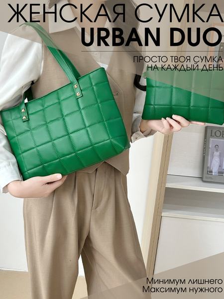 Urban Duo: Комплект сумок для каждого случая Что в комплекте? Большая сумка-тоут: Просторная, удобная и функциональная. Идеально подходит для ежедневного использования — от работы до прогулок с друзьями. Маленькая сумка-кошелёк: Удобный аксессуар для важных вещей (деньги, телефон, ключи). Можно носить через плечо или как кроссбоди. Почему вам понравится? Компактность и вместительность: Большая сумка помещает всё необходимое, а маленькая — ваши самые нужные мелочи. Удобство: Широкие ручки большого тоута не утомляют даже при длительной переноске, а ремешок маленькой сумки позволяет носить её комфортно и свободно. Дизайн: Клетчатый узор и глянцевая текстура делают сумки современными и приятными на вид. Многофункциональность: Большую сумку можно использовать как повседневную, а маленькую — как мини-сумку для светских выходов. Как использовать? На работу: Большая сумка для документов и личных вещей. Маленькая — для телефона и кошелька. На прогулку: Большая — для покупок и всего, что взяли с собой. Маленькая — для ключей, карт и настроения. На вечеринку: Маленькая сумка — стильное дополнение к вашему образу, а большая останется дома в покое. Материалы и качество: Материал: Выполнена из мягкой и прочной экокожи , которая выглядит дорого, но при этом экологична и приятна на ощупь. Фурнитура: Надежные застёжки на молнии и качественные металлические элементы. Размеры: Большая сумка: Вместительная, практичная, готова к любым задачам. Маленькая сумка: Минималистичная, но вместительнее, чем кажется. Зачем вам этот комплект? Практичность: Две сумки в одном комплекте — экономия времени и пространства. Порядок: Большая сумка поможет держать всё под рукой, а маленькая — быть готовой к любому повороту. Универсальность: Подходит под любой день, образ и настроение.