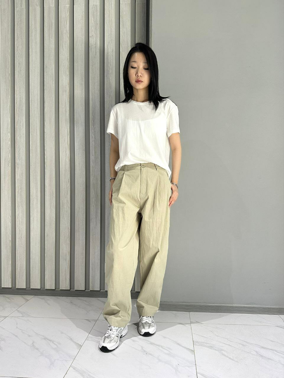 Фасон: Прямые, свободного кроя. Брюки не облегают ноги, создавая расслабленный силуэт. Посадка: Средняя или слегка завышенная посадка — брюки сидят на талии. Длина: Полная длина — брюки доходят до обуви и слегка её прикрывают. Цвет: Фисташковый, хаки, тёмно-серый Материал: Хлопок. Детали: Есть стрелки или чёткие складки спереди, что придаёт им более структурированный вид. Карманы спереди Застёжка на молнии и пуговице. Пояс выглядит гладким, без видимого ремня или шлёвок Стиль и сочетания: Эти брюки — универсальная база для гардероба в стиле casual, смарт-кэжуал или минимализм. Их можно сочетать с футболками, рубашками, топами и даже пиджаками. Обувь — от кроссовок до лоферов или ботинок.
