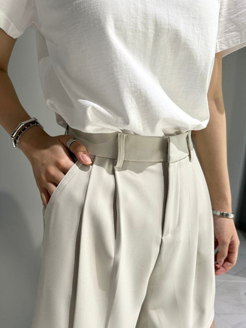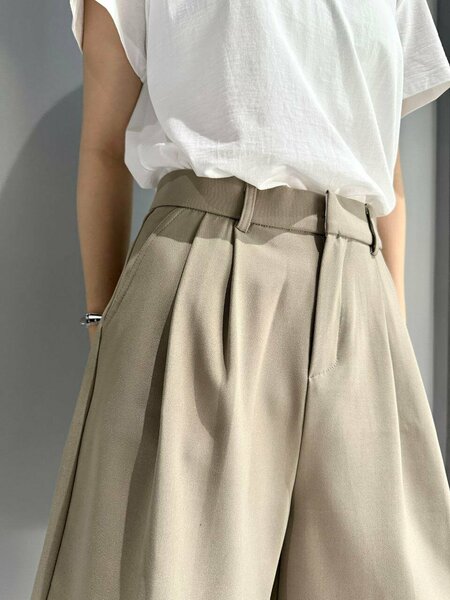 Цвет: Бежевый, молочный Материал: полиэстер с добавлением вискозы или эластана — гладкая, с лёгким матовым блеском, хорошо держит форму. Фасон: Прямой свободный крой с расширением к низу — шорты выглядят слегка расклешёнными, создавая эффект лёгкости и комфорта. Посадка: Средняя или высокая (пояс расположен ближе к талии). Детали: Заутюженные складки (защёлки) спереди придают объём и строгий силуэт. Пояс со шлёвками под ремень. Классическая ширинка с застёжкой на молнию и пуговицу/крючок (прикрыта планкой). Боковые карманы в швах Длина: До середины бедра или чуть выше колена — в зависимости от роста. Подгибка: Аккуратно обработанный низ с машинной строчкой. Стиль и назначение: Эти шорты подойдут как для повседневной носки, так и для офиса или делового casual-образа в тёплую погоду. Легко сочетаются с рубашками, футболками, топами и жакетами. Отличный вариант для минималистичного гардероба.